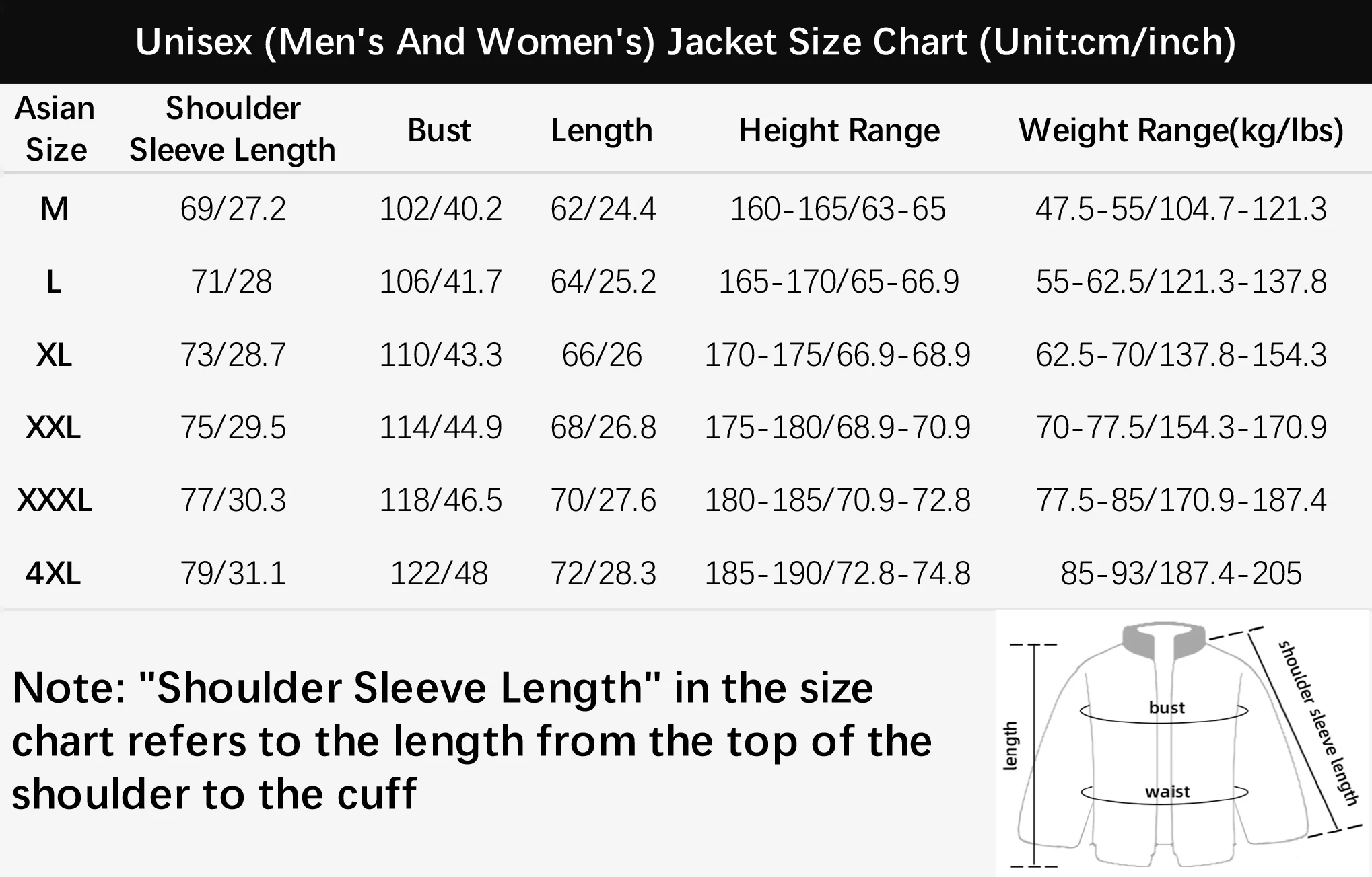 5. Note: "Shoulder Sleeve Length" in the size chart refers to the length from the top of the