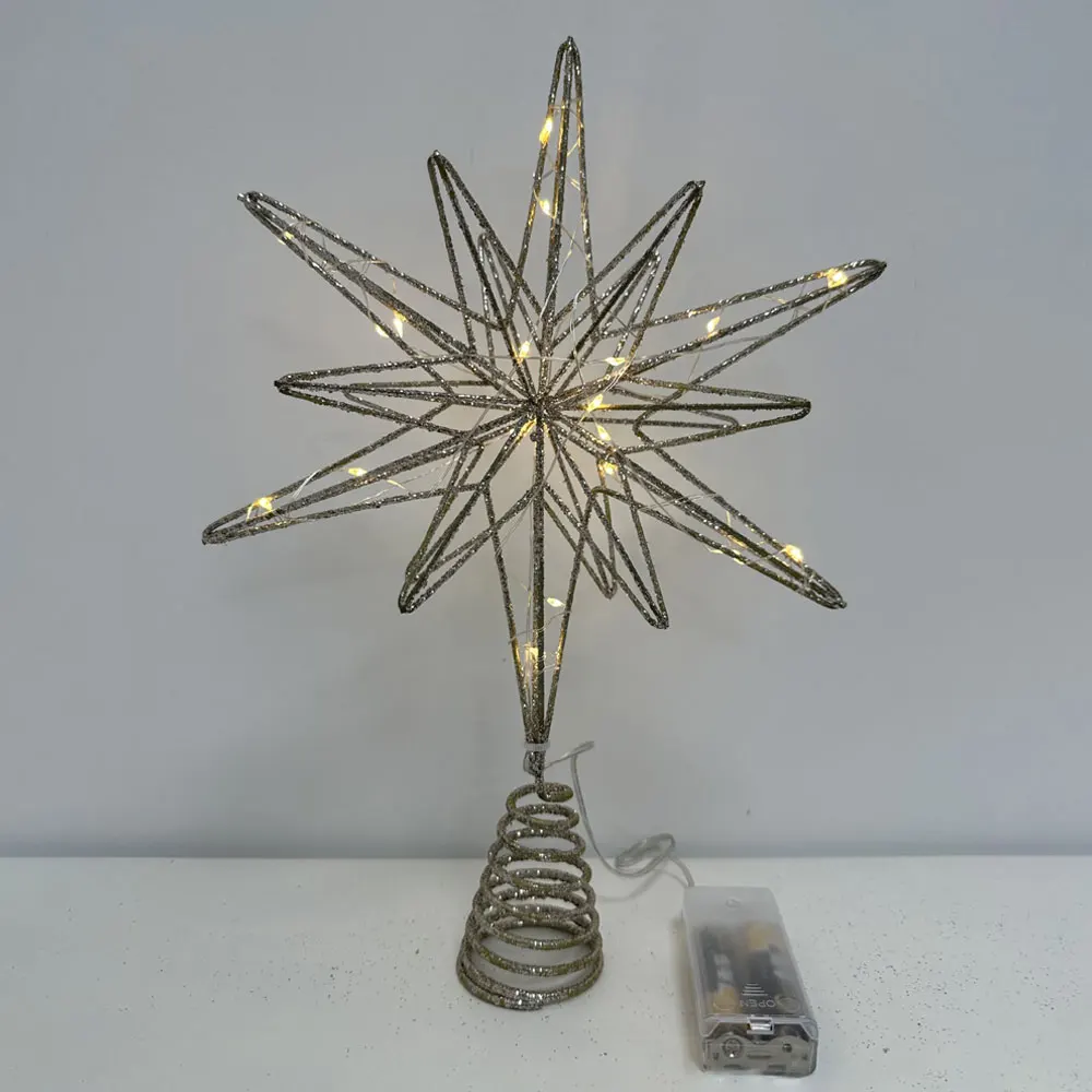 Hollow-carved gold star Christmas tree topper with 20 LED lights. Battery-powered, easy to install, and perfect for adding a sparkling festive touch to trees, bedrooms, or living spaces.
