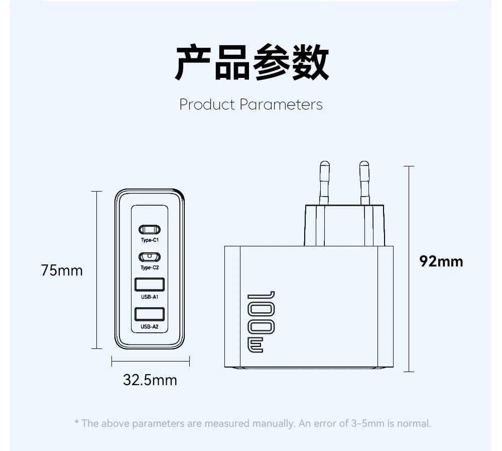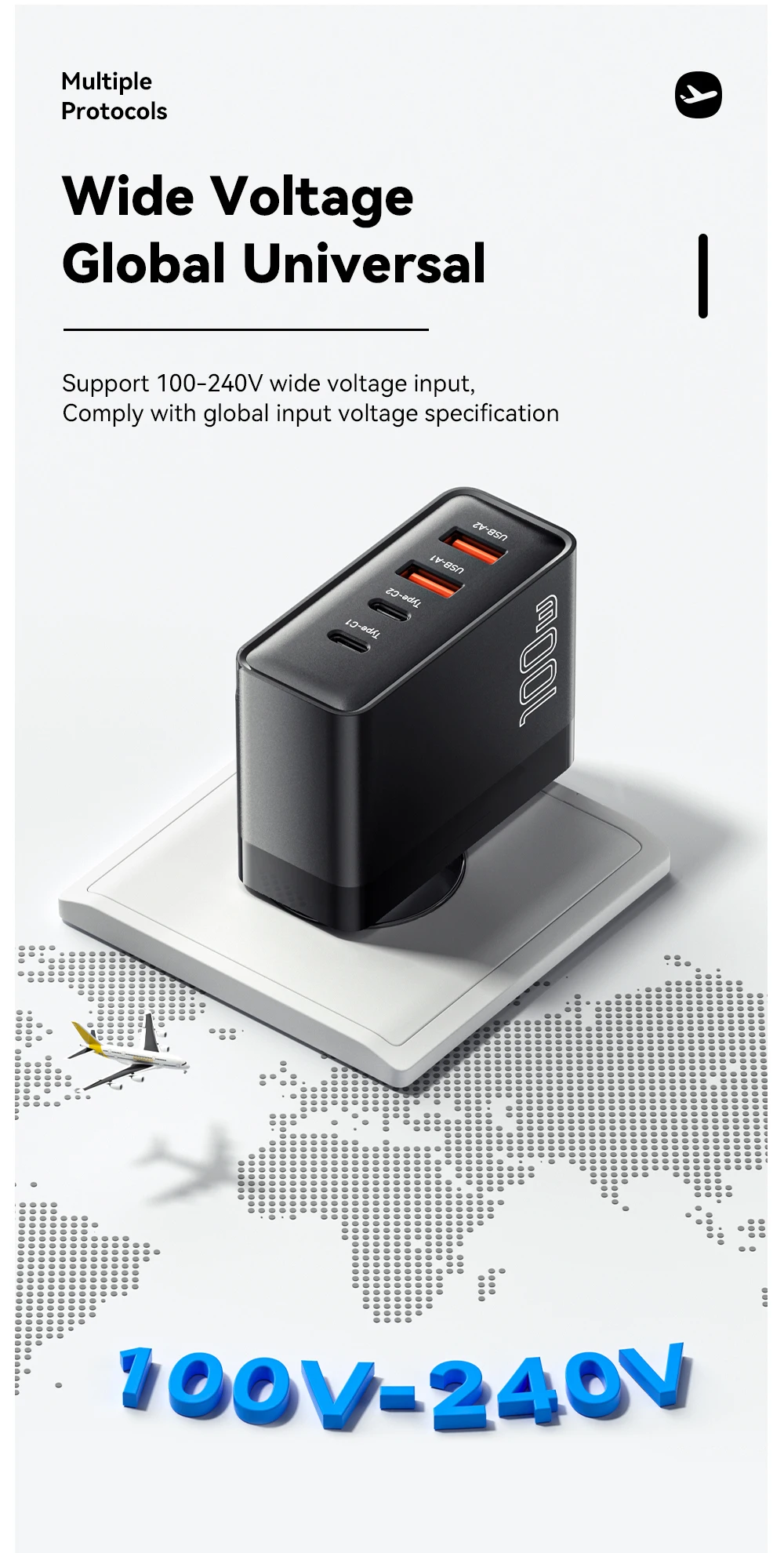 Feature 1:100W2C2A four port combination, suitable for simultaneous charging of multiple devices (laptops, tablets, phones, headphones).
