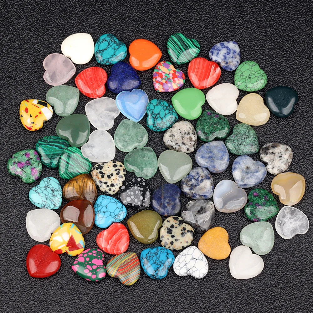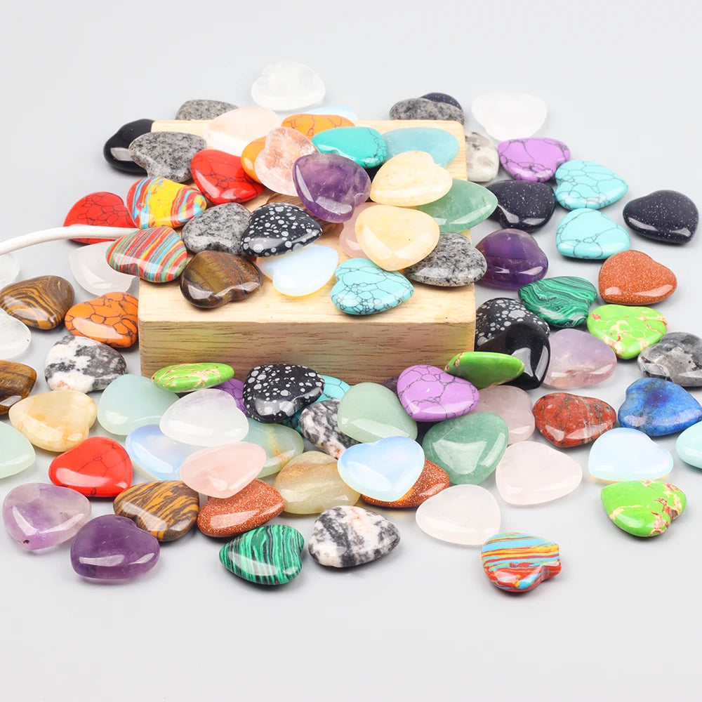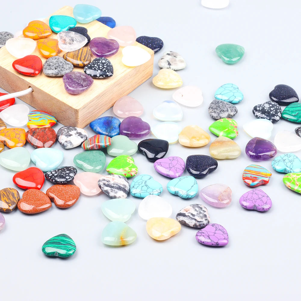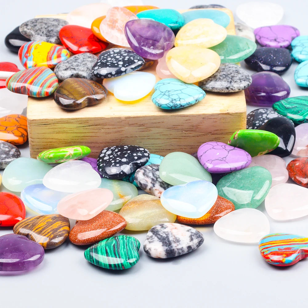 Heart-shaped stone crystals for decorative use. Each piece measures about 20 mm in width, 20 mm in height, and 6 mm in thickness, with an approximate weight of 3–5 g. The stones feature a mix of natural crystal colors and come in a random color assortment.