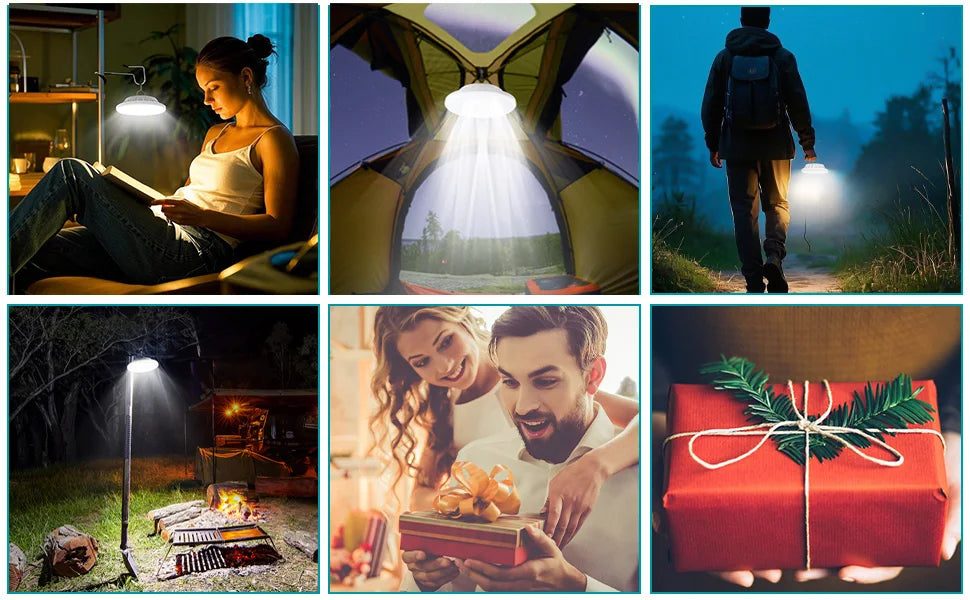 Solar camping light rechargeable: Our Tent Lights features solar charging panel and 3 pieces built-in 18650 rechargeable battery, can be charged by solar or USB cable. (Included USB cable) rechargeable camping lamp can be used as a power bank in an emergency. Good emergency lights for home.