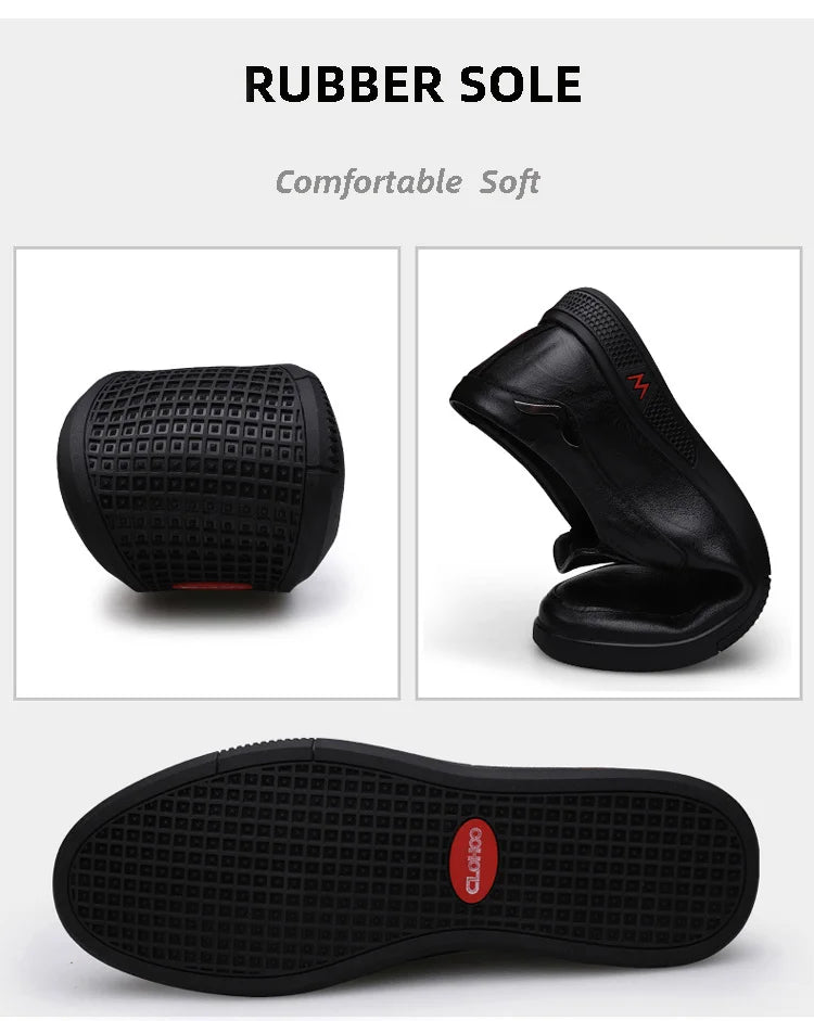This men's casual shoe features a handcrafted layered cowhide leather upper, a slip-on closure, and a rubber outsole. The insole is made from polyurethane, and the design includes a breathable interior for airflow.