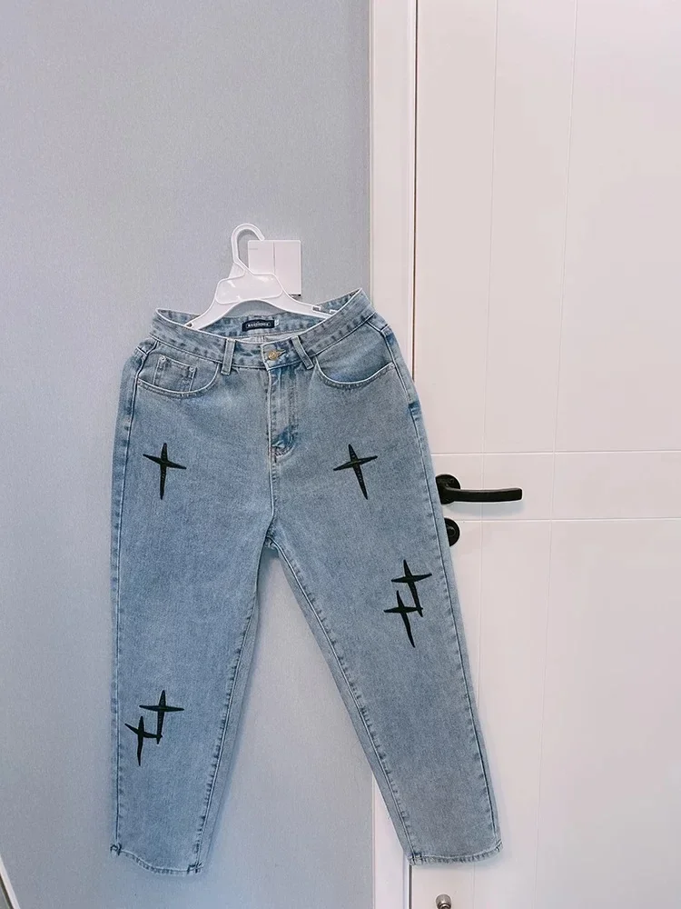 Mens Loose Cargo Jeans Boyfriend Straight Fit Star Print Wide Leg
