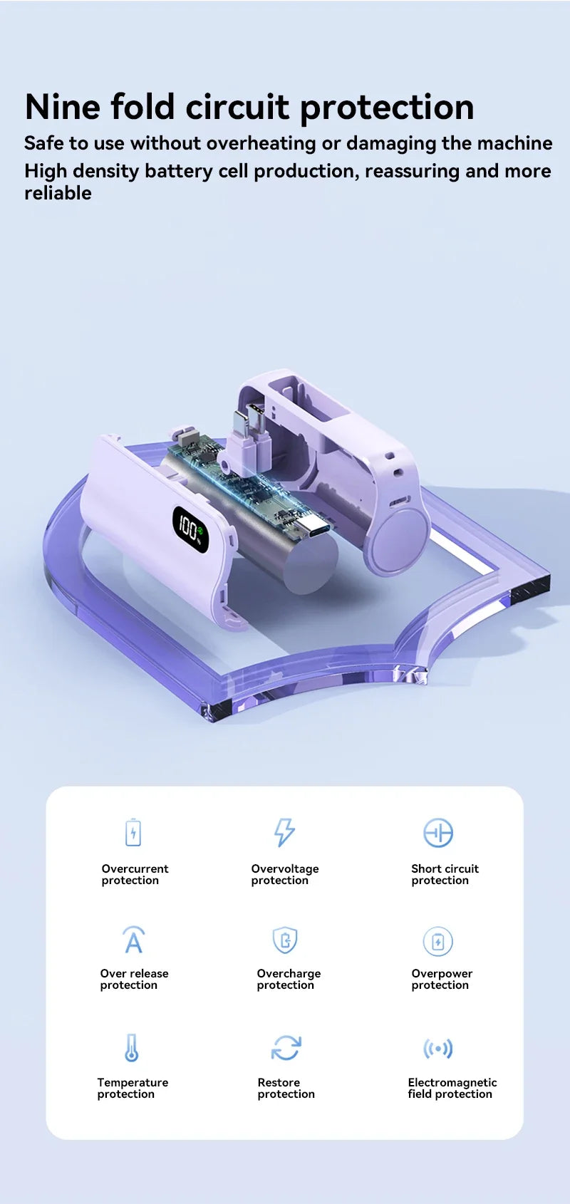The power bank includes built-in protection against overcharging, over-discharging, overheating, and short circuits, ensuring the safety of both the power bank and your devices.