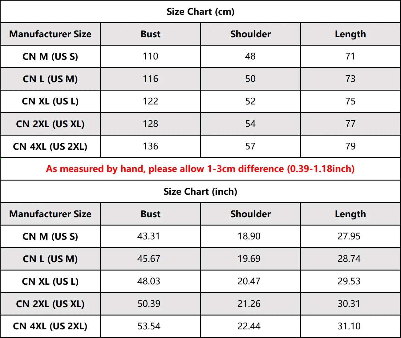 Manufacturer Size: default size is CN size