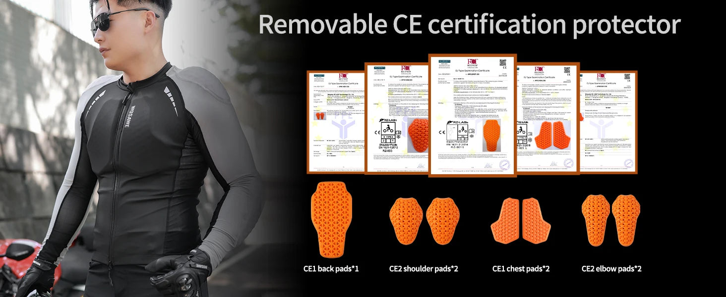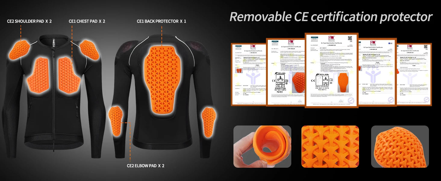 5. 【Easy On-Off, Ride or Sport】 Removable CE-certified armor (shoulder/elbow/chest/back), soft armor for riding; remove pads for sportswear, easy switching for various scenarios.