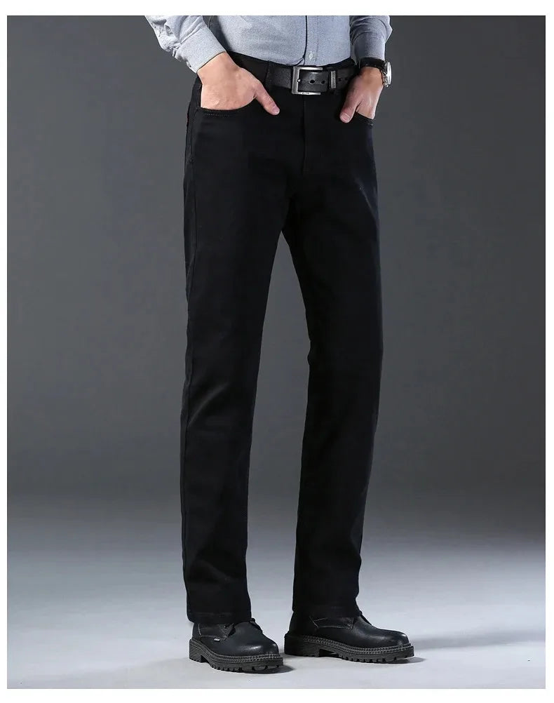 These men's straight-leg jeans are crafted from midweight denim with a slight stretch to support daily movement. The color is black and the full-length cut delivers a timeless silhouette suitable for casual wear and workplace settings. The zipper fly and mid-rise waist provide practical, everyday fit.