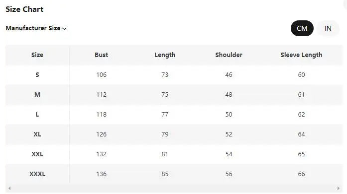 size_info: {"sizeInfoList":[{"length":{"cm":"106","inch":"41.73"},"size":"S","vid":-1},{"length":{"cm":"112","inch":"44.09"},"size":"M","vid":-2},{"length":{"cm":"118","inch":"46.46"},"size":"L","vid":-3},{"length":{"cm":"126","inch":"49.61"},"size":"XL","vid":-4},{"length":{"cm":"132","inch":"51.97"},"size":"XXL","vid":-5},{"length":{"cm":"136","inch":"53.54"},"size":"XXXL","vid":-6}]}