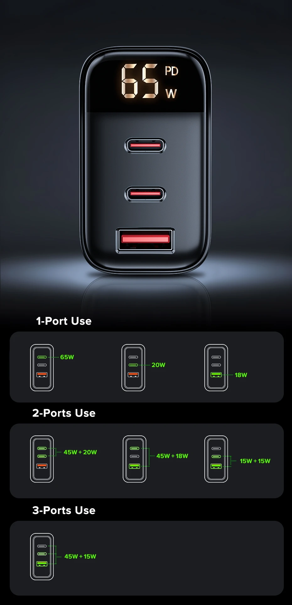USB C1 + USB C2 + USB Output Total: 45W+18W