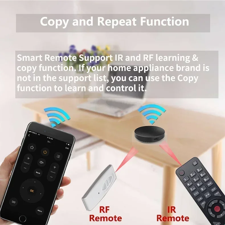 1. The Smart IR Remote only supports infrared remote control and Fixed coding RF 433/315MHz , and does not support Bluetooth or 2.4G remote control.