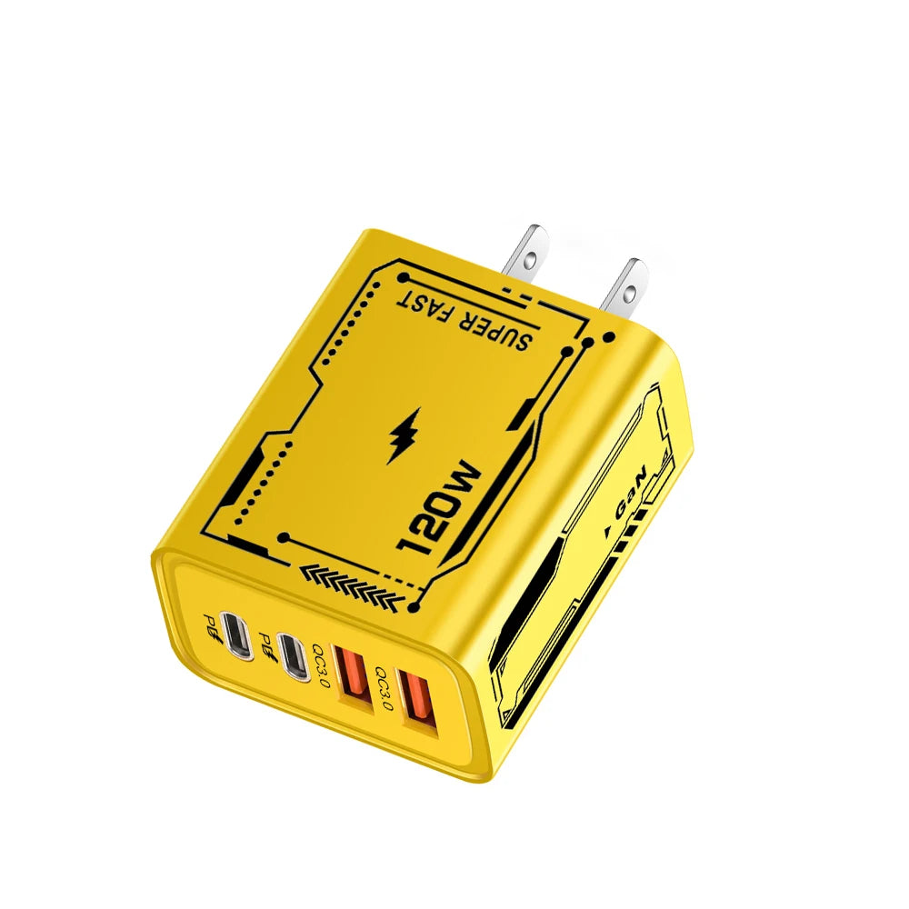 This four-port USB wall charger provides charging from a single outlet. The total output is up to 120 watts, shared across all ports.