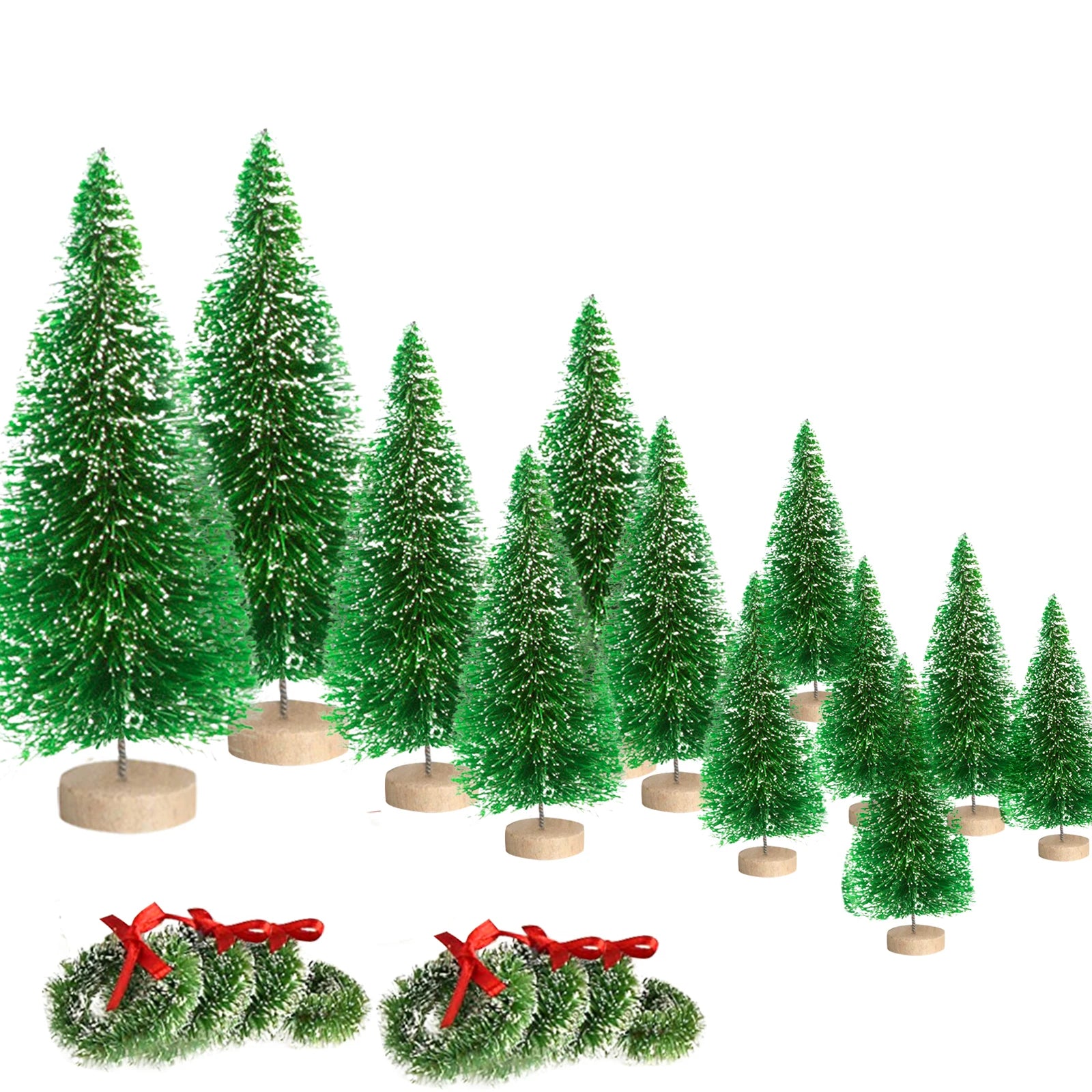 Create charming winter scenes with this set of 12 frosted mini Christmas trees and 8 small wreaths. Made with high-quality wood and durable synthetic bristles, these trees are flexible and easy to arrange for Christmas decorations, craft projects, train layouts, tabletop displays, and holiday villages. Ideal for adding festive cheer to homes, offices, and creative DIY setups.