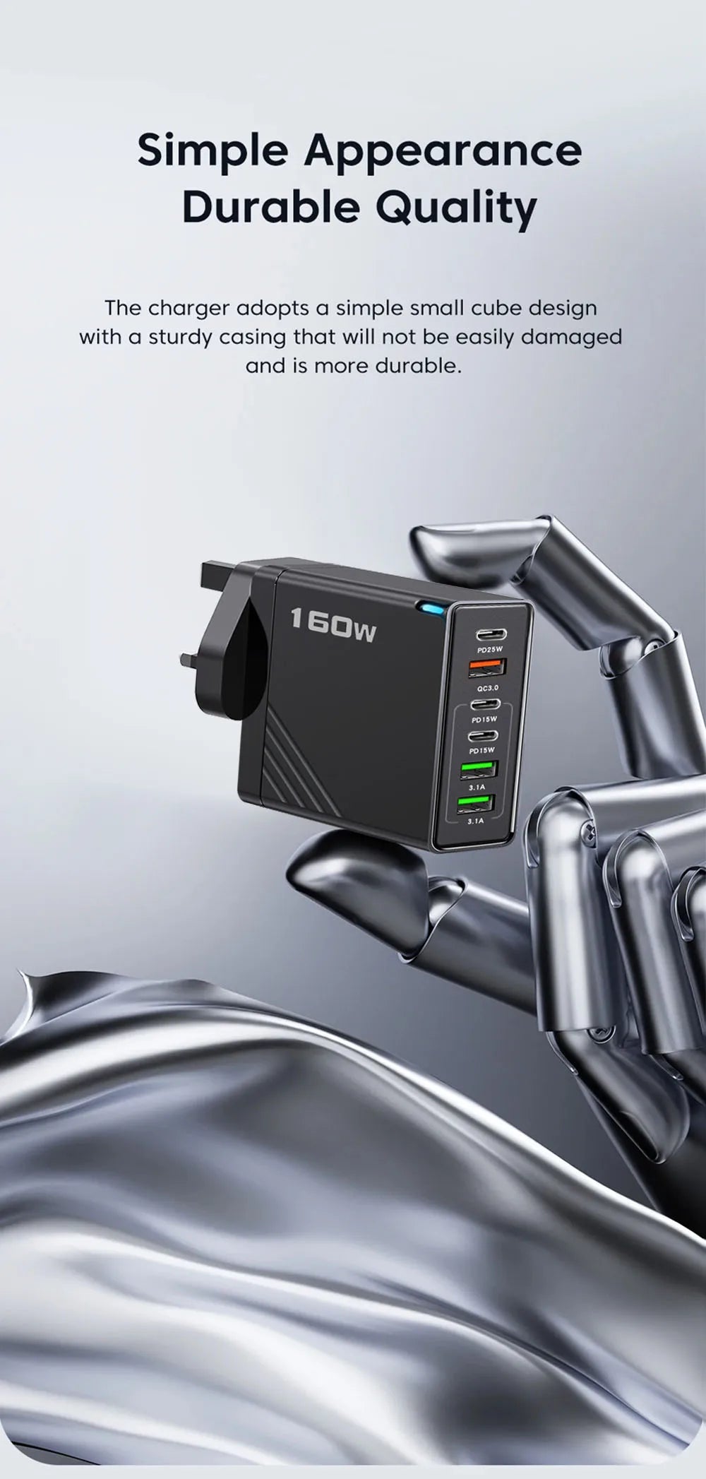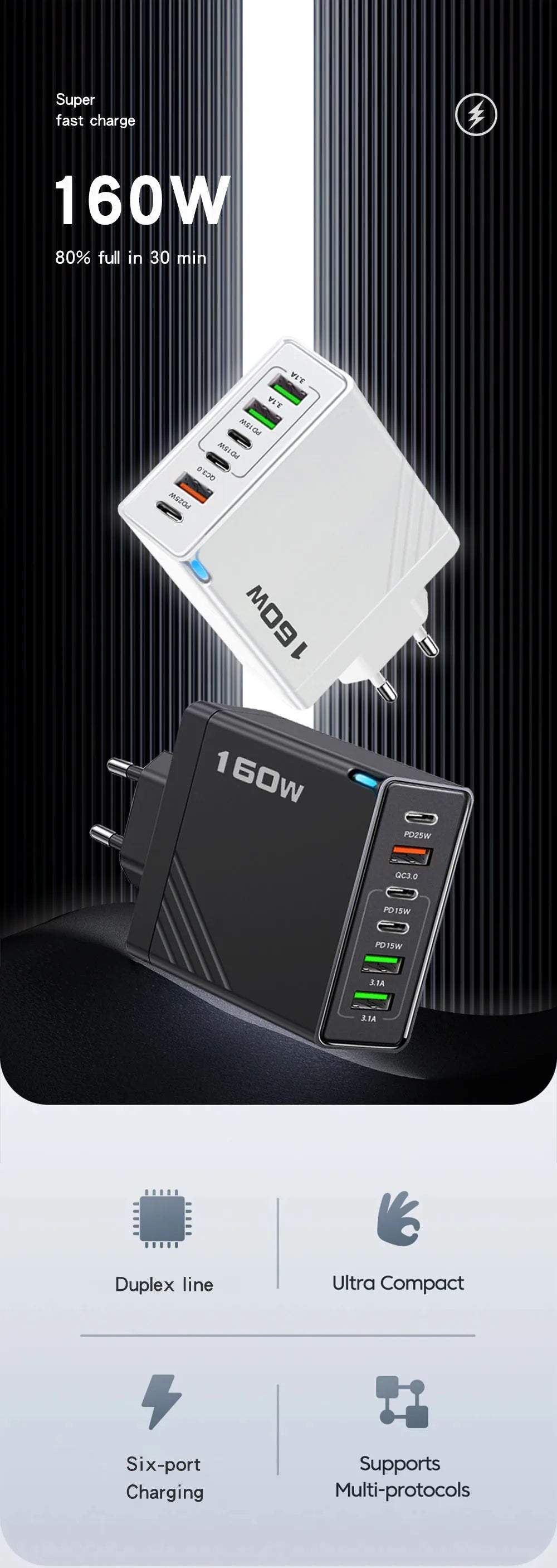 160W 6 Ports Fast Charger USB Type C Quick Mobile Phone Charger EU US UK Plug Charger Adapter For iPhone 16 Pro Samsung Xiaomo