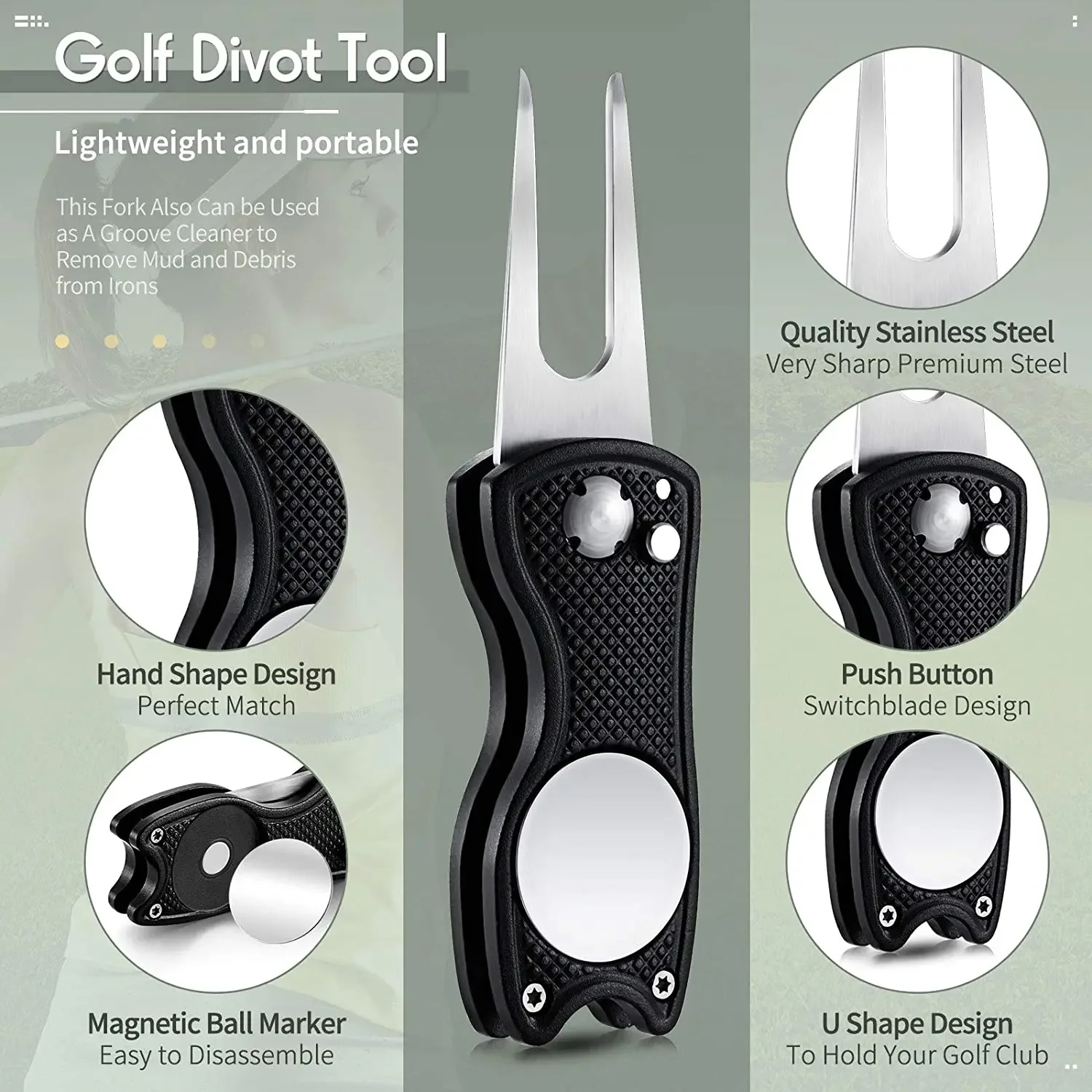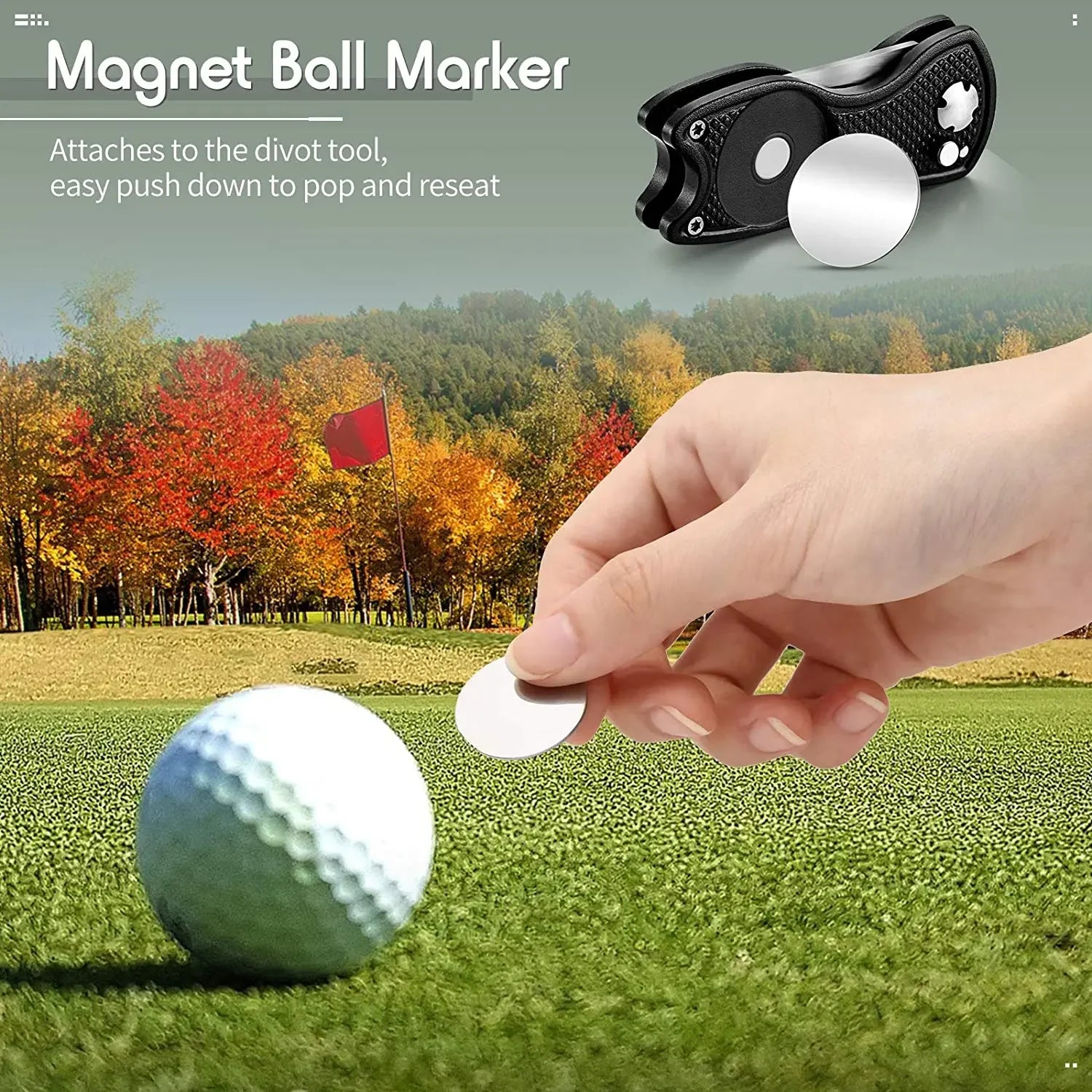 Pop down button for easy unfold of the golf divot tool. Comes with a magnetic detachable ball marker.