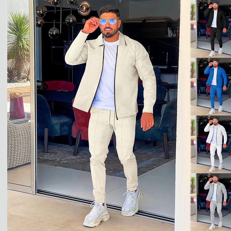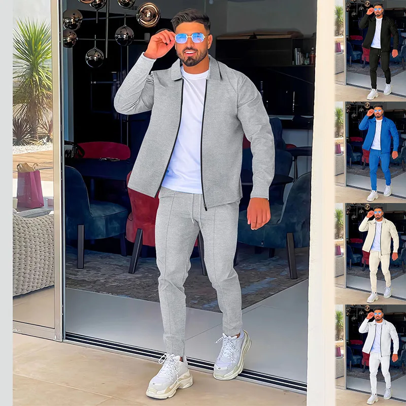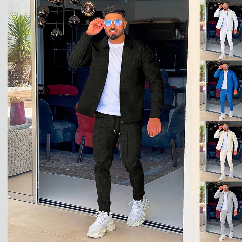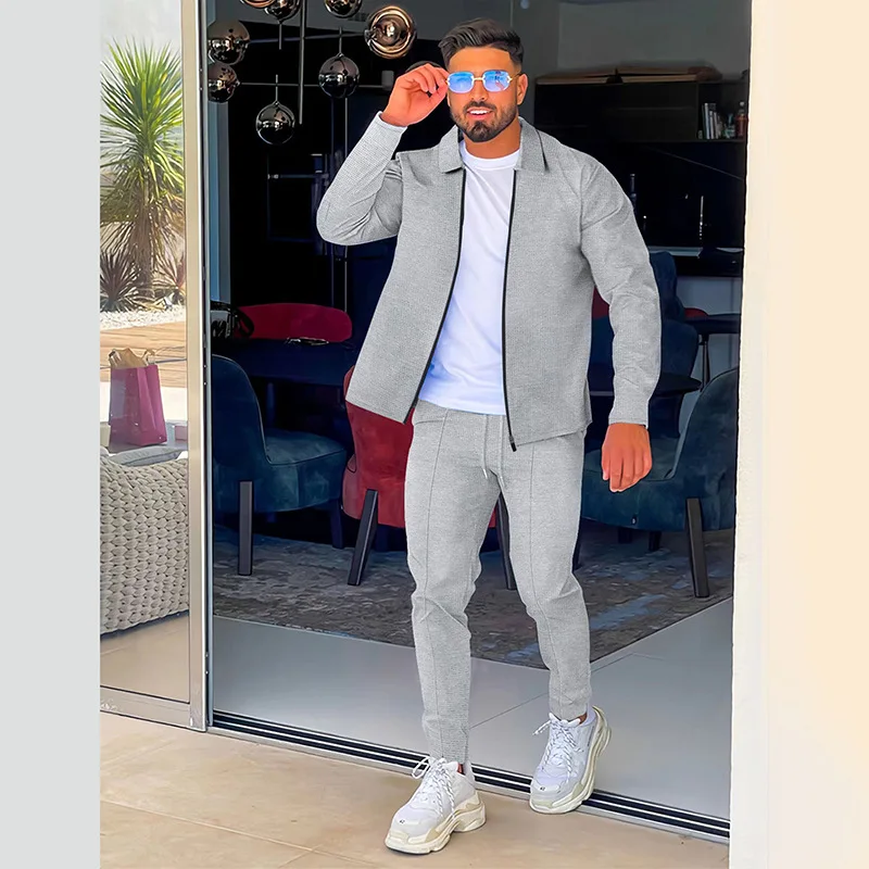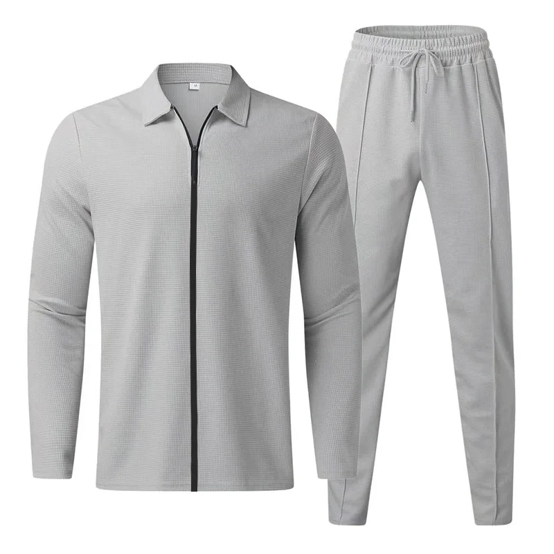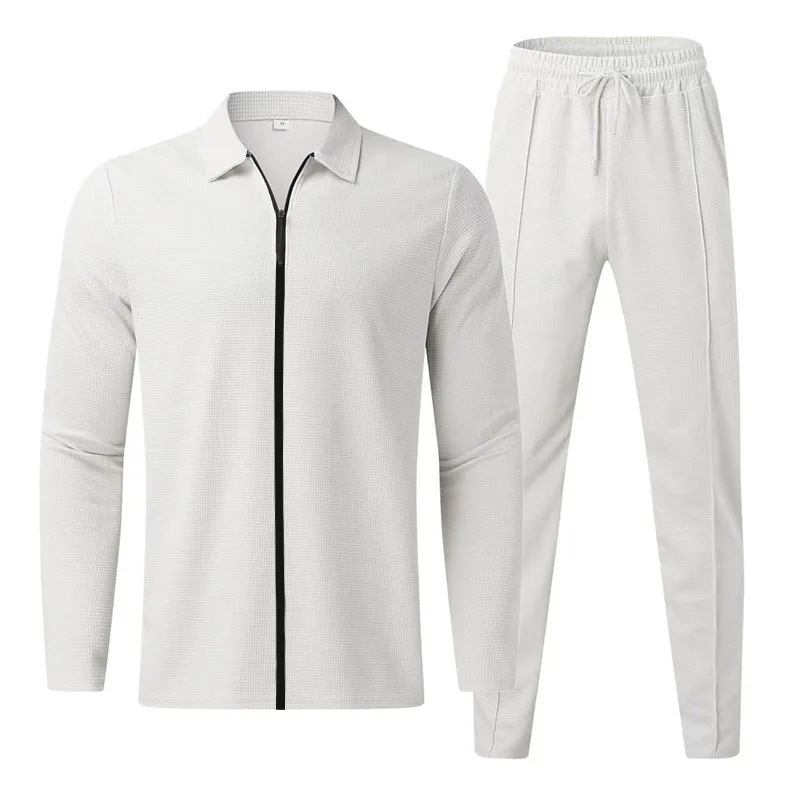 2024 men's new waffle long-sleeved lapel zipper cardigan casual sports suit