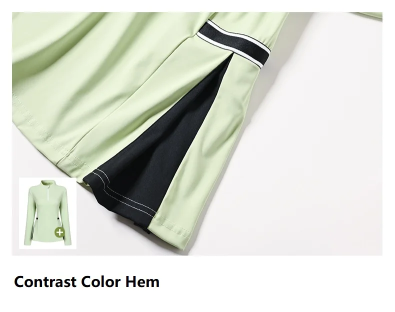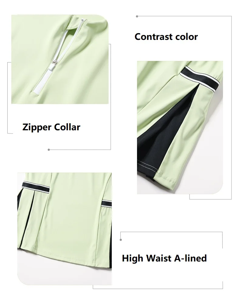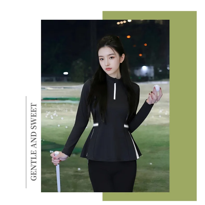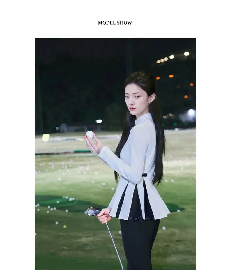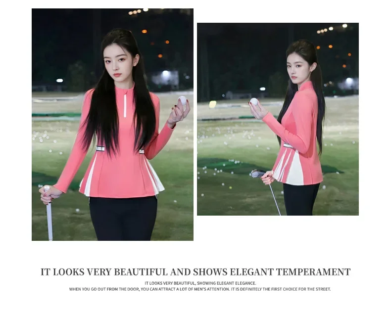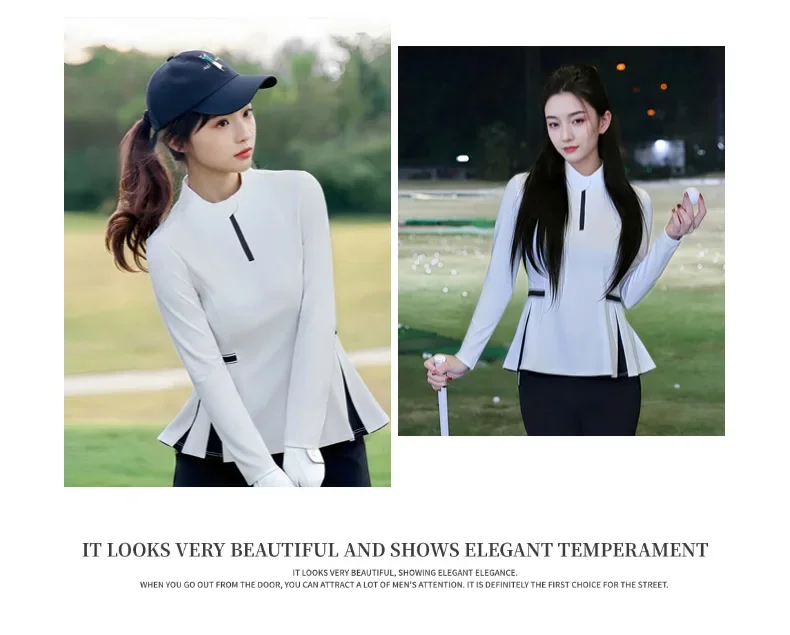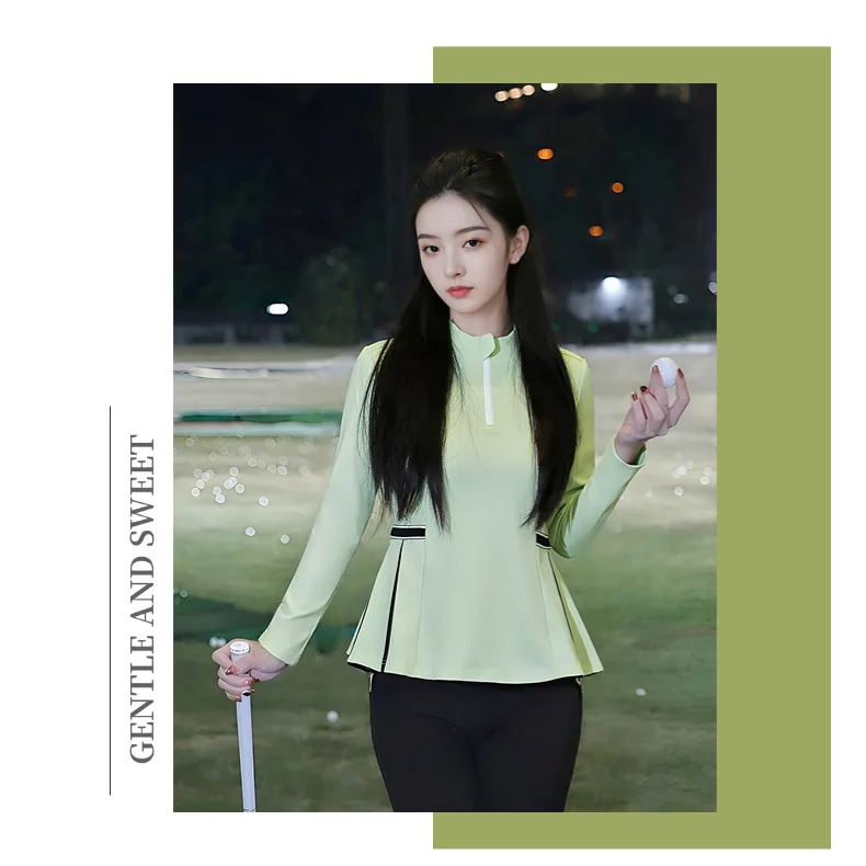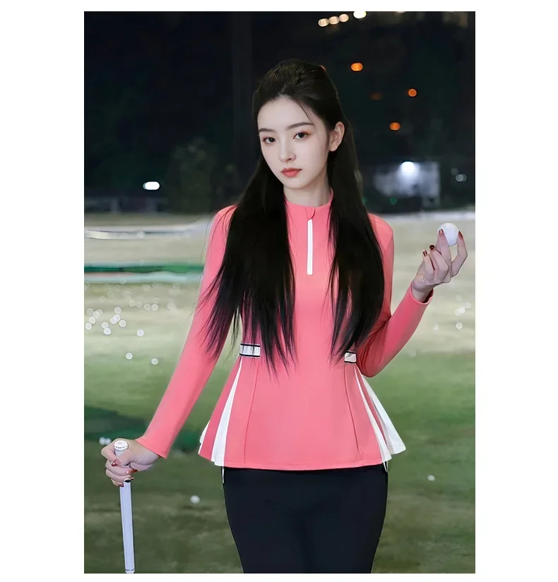 Women Spring Autumn Golf Clothing Lady Golf Long-sleeved Sports Shirt Elastic Slim Tops Zipper Collar T-shirt Patchwork Pleated Hem