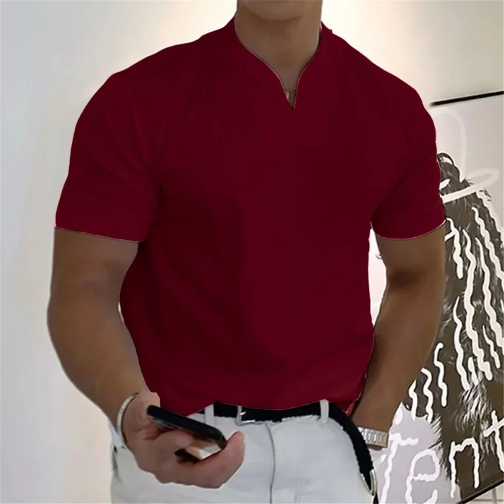 2025 Summer New Men's Fashion Trend T-shirt Short Sleeve V-neck Top Elastic Cotton Fitness Sports Loose Large Size Clothing