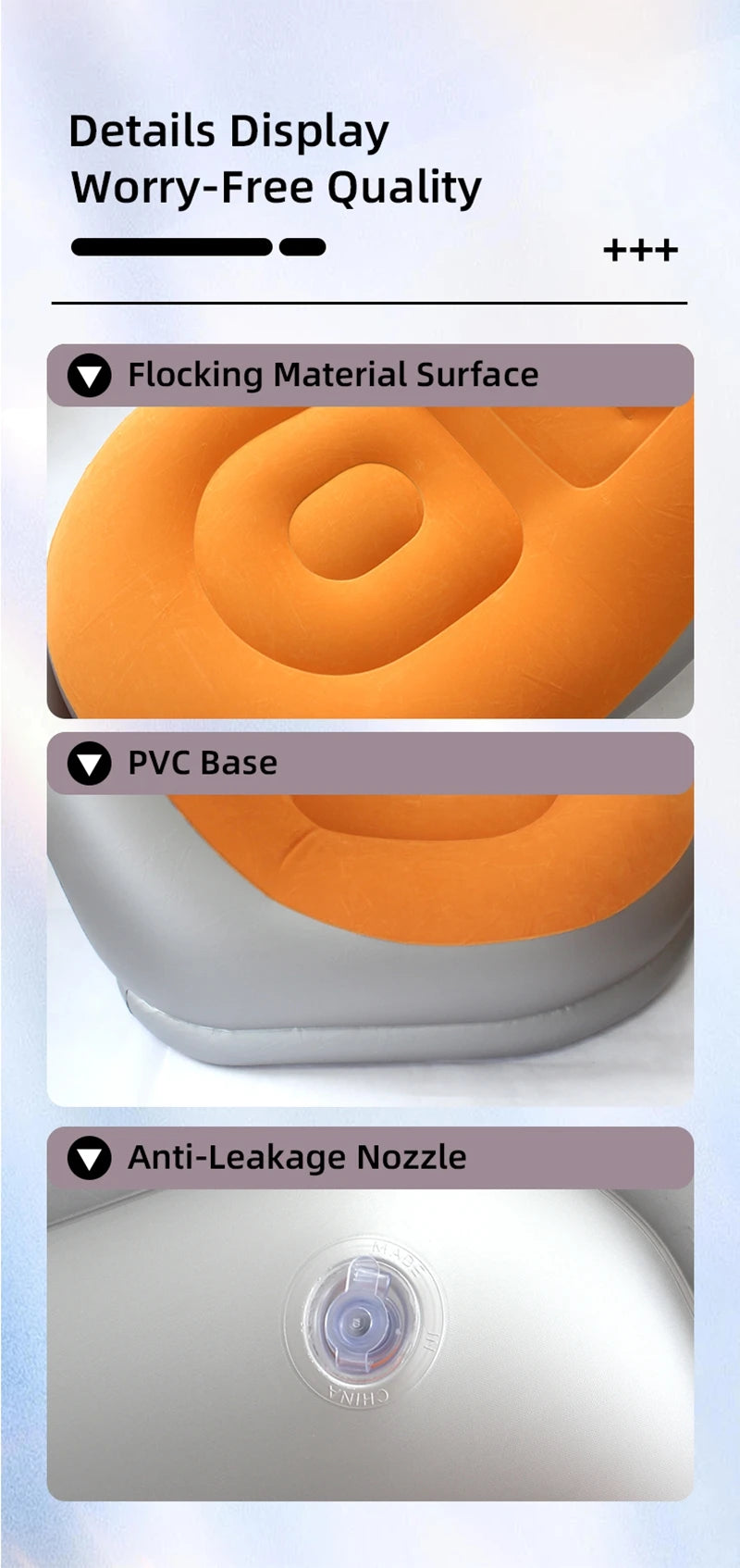 【Premium Material Lounger Chair】This air sofa inflatable couch is made of high quality flock on the top surface and thick PVC material on the bottom, 100% safe and eco-friendly, more durable to use and not easy to get punctured.