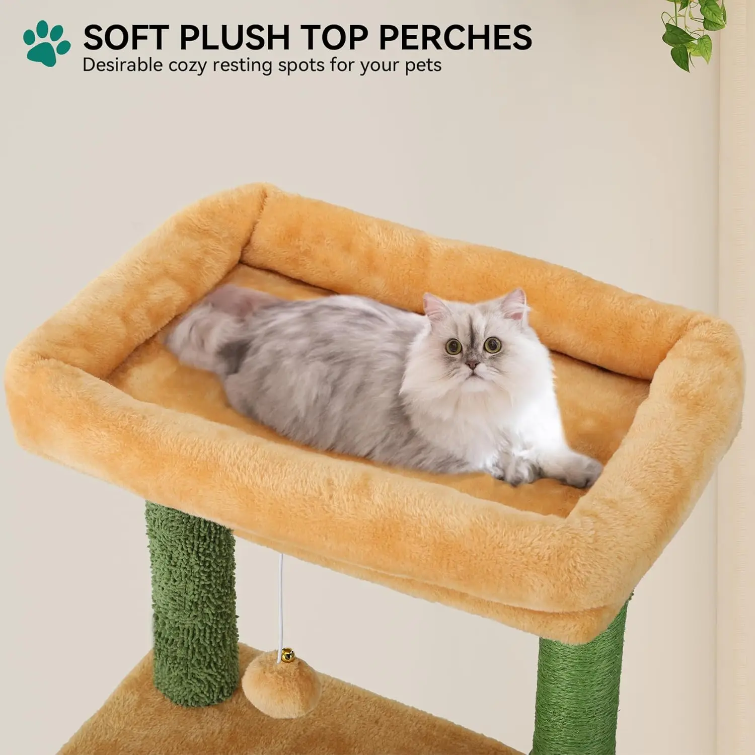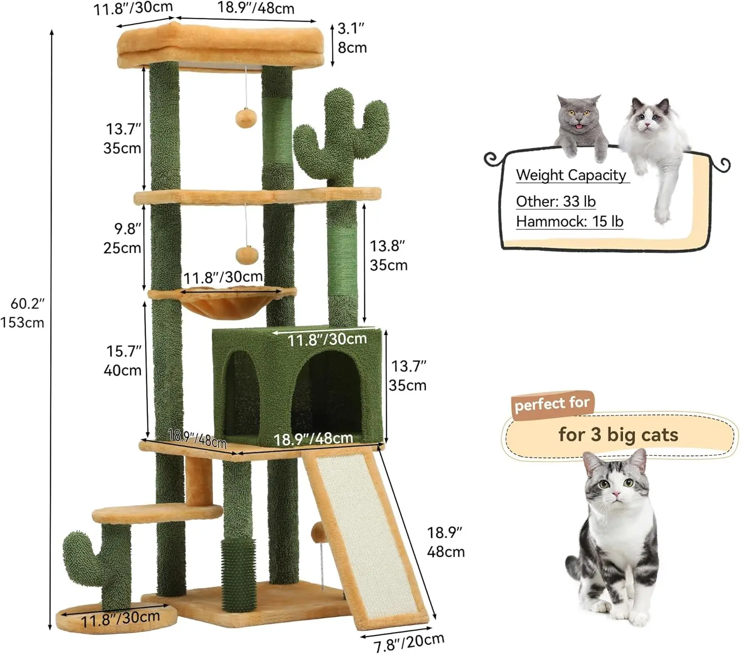 60in Tall Cactus Cat Tree Tower with Self-Grooming Brush, Climbing Condo, Perch, Basket, Scratching Posts for Indoor Cats