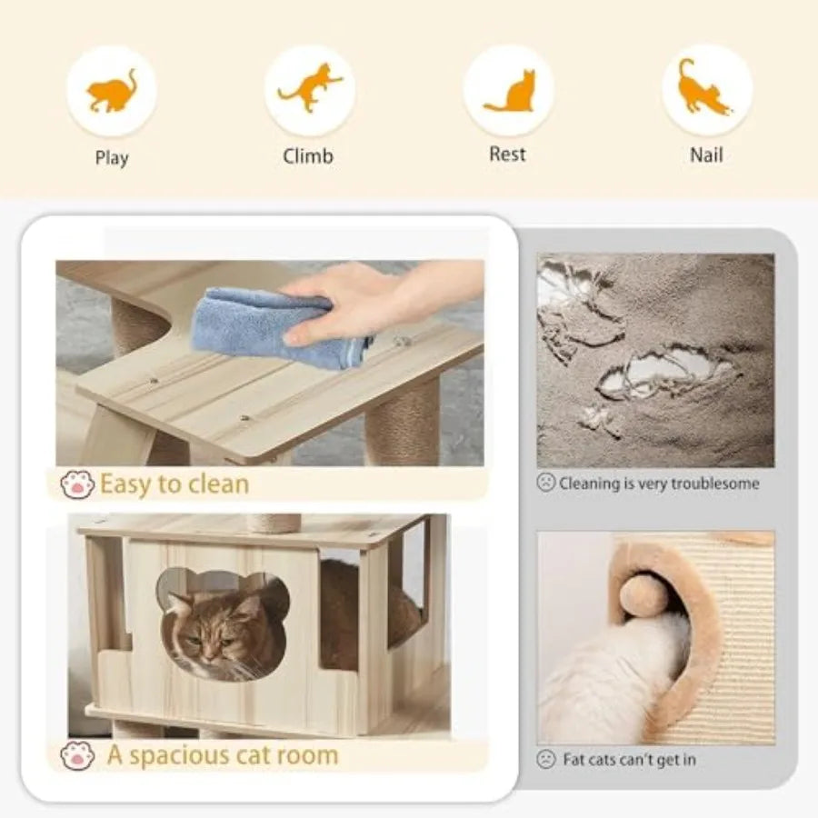 65-Inch Multi-Purpose Wooden Cat Tree Tower with Condo Design Featuring 13 Scratch Posts Padded Platform Bed Interactive Toy Ba