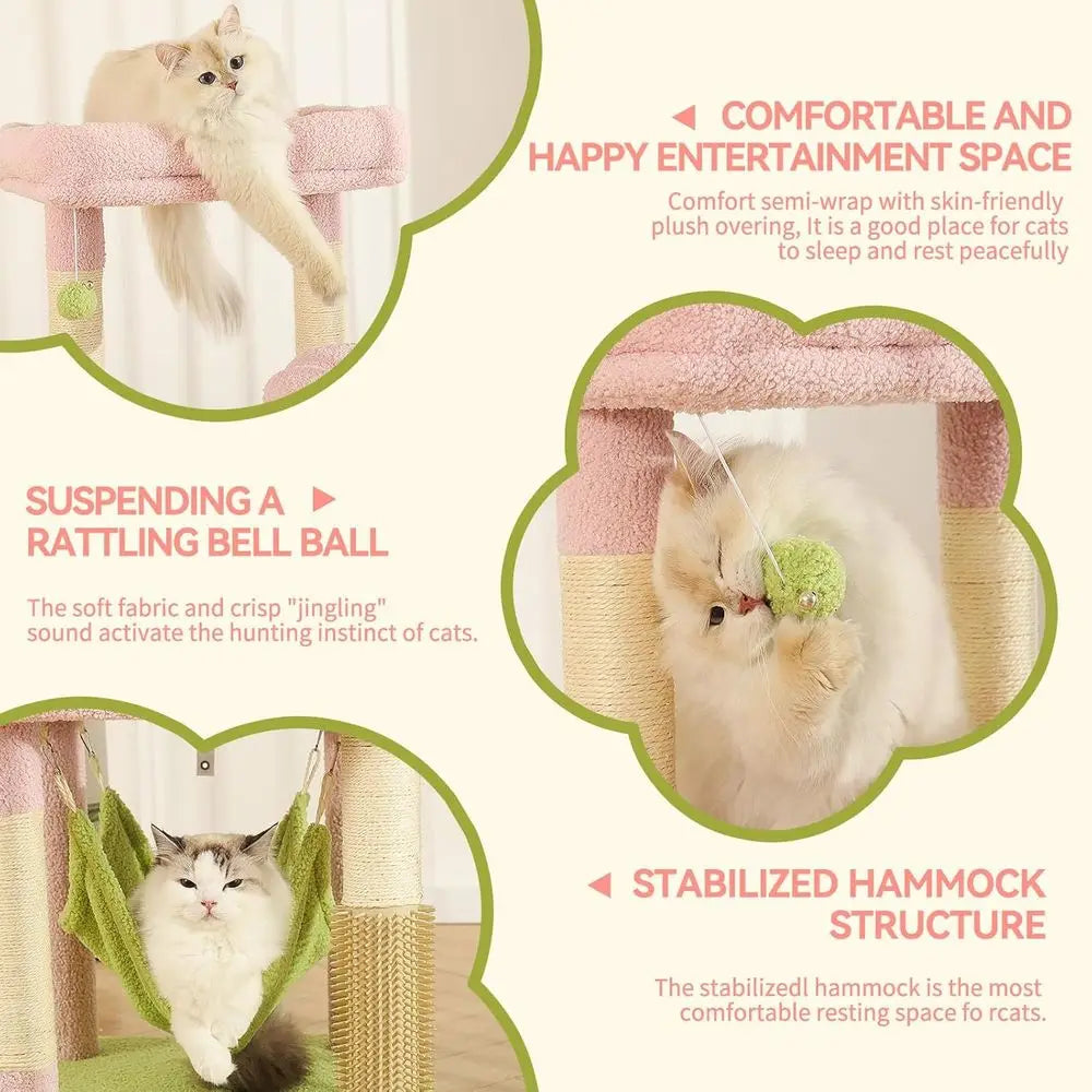 This spacious multi-cat haven is designed to accommodate four or more cats at once, featuring ample platforms, two separate condos, and a comfortable hammock, making it perfect for households with multiple cats. It serves as an all-in-one fun zone, complete with two cat apartments, durable sisal-wrapped scratching posts and boards, a steel-reinforced hanging bed, and large rest platforms, eliminating the need for additional toys.