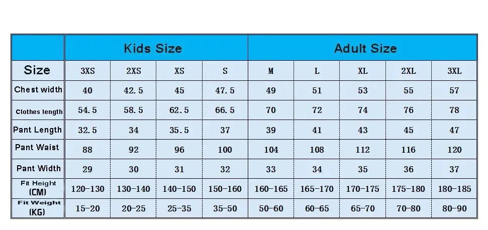 Kids size 3XS: suitable for kids height 120-130cm, weight 15-20kg;