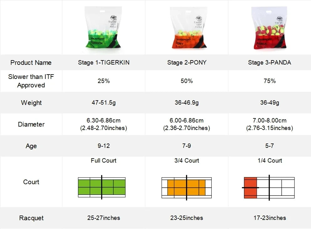 🔴STAGE 3 PANDA - 75% slower, Large, low-compression felt bounces 75% lower than regular tennis balls and ideal for practice on 36' courts, driveways and playgrounds, Recommended used with 19" - 23" rackets.