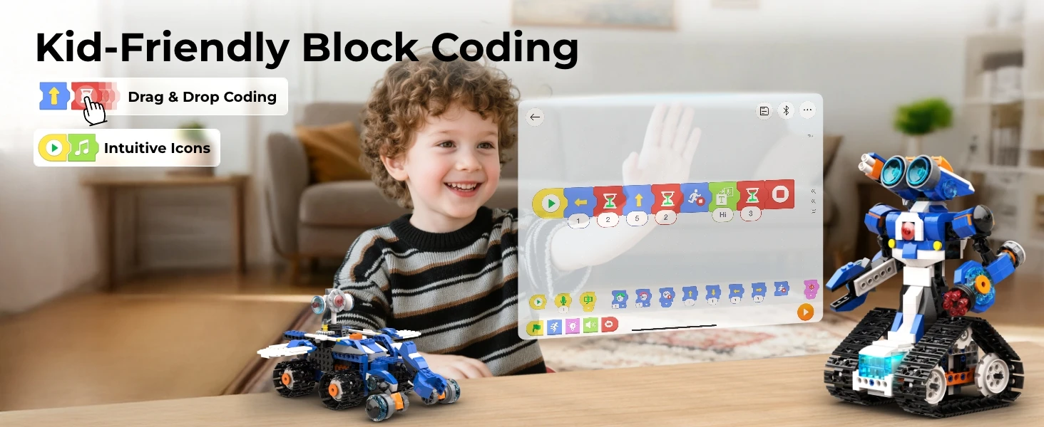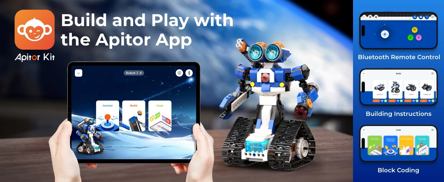 Control your robot via Bluetooth with 4 user-friendly modes: dual-motor, single-motor, gyro, and path mode. Download the free Apitor Kit app for step-by-step instructions, and watch your child learn programming and robotics independently!