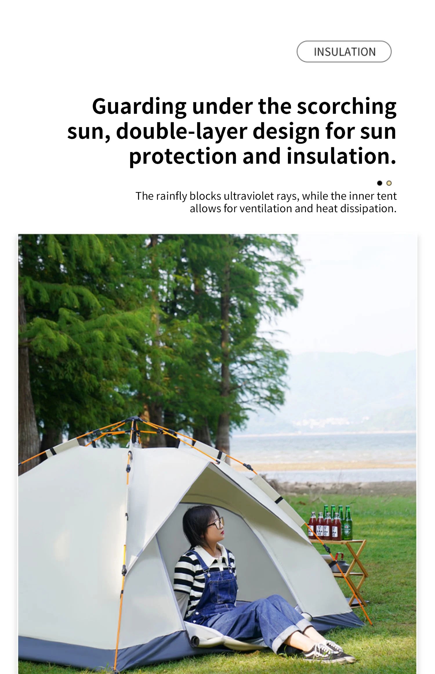 • Key features: silver-coated inner layer reduces ultraviolet exposure; double-door design with high-density mesh for insect prevention and ventilation; quick-opening mechanism