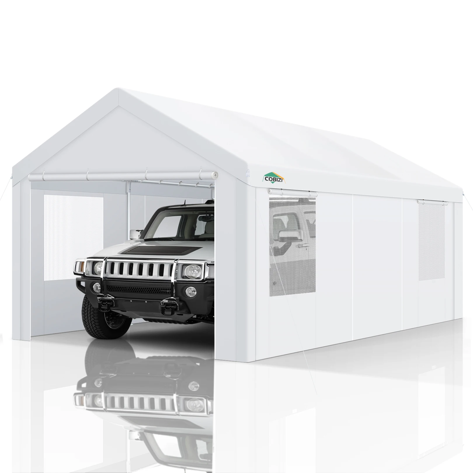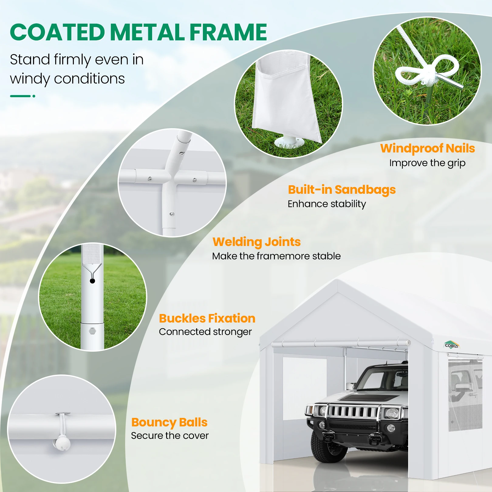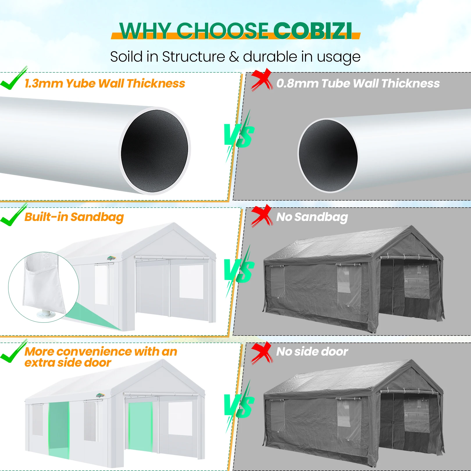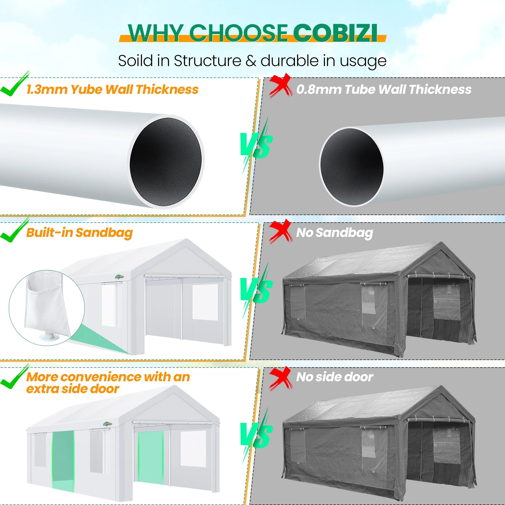 ✅ 【Heavy Duty Structure 2.0】 The COBIZI carport is made of a rust-proof powder-coated steel frame to prevent chipping, peeling, rusting and corrosion. The structure has 8 solid legs made of 1.5-inch galvanized steel pipes, and portable carport comes with built-in sandbags, making the entire steel carport safer and more stable.