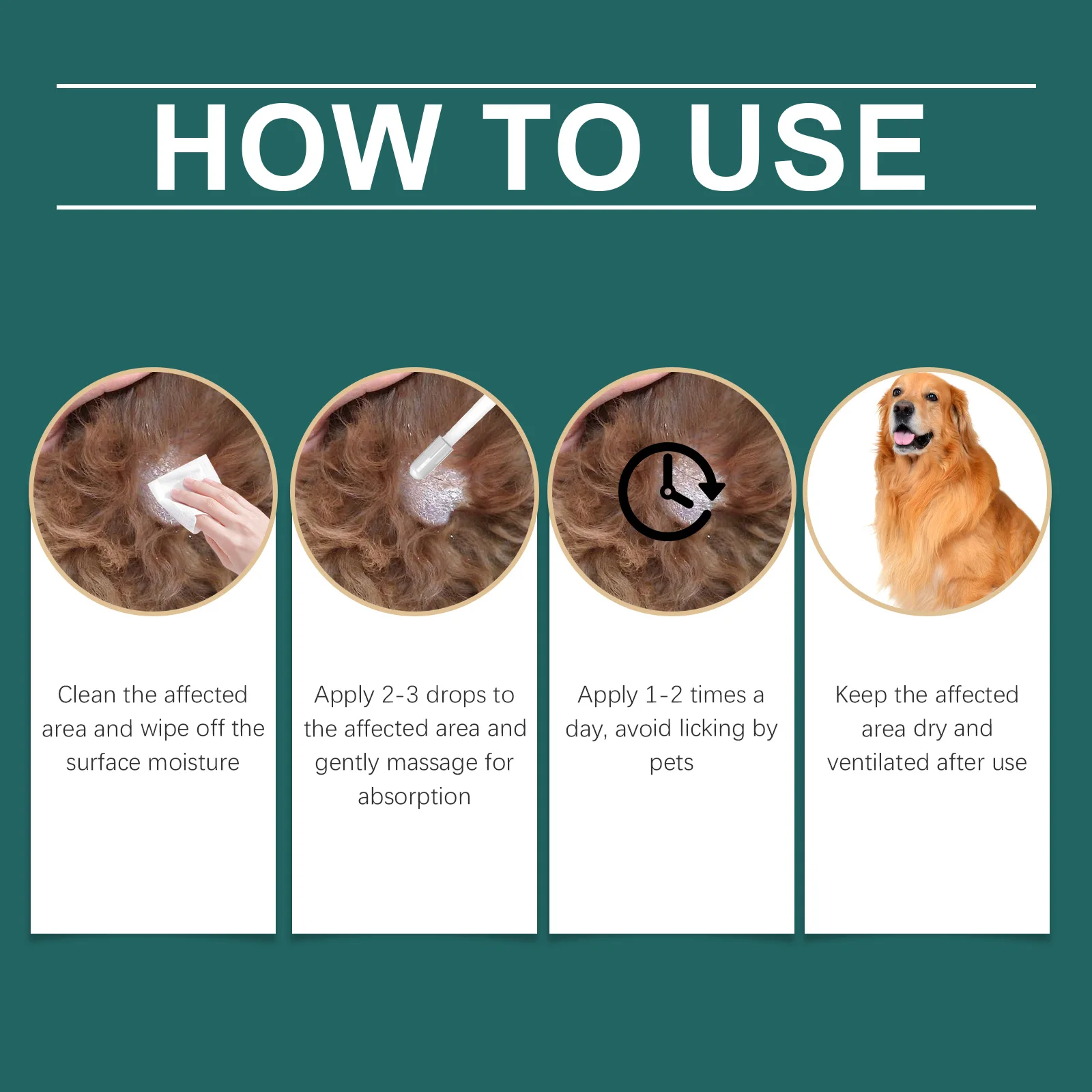 Clean the affected area and wipe off surface moisture. Apply 2-3 drops to the affected area and gently massage until absorbed. Apply 1-2 times a day and prevent pets from licking.