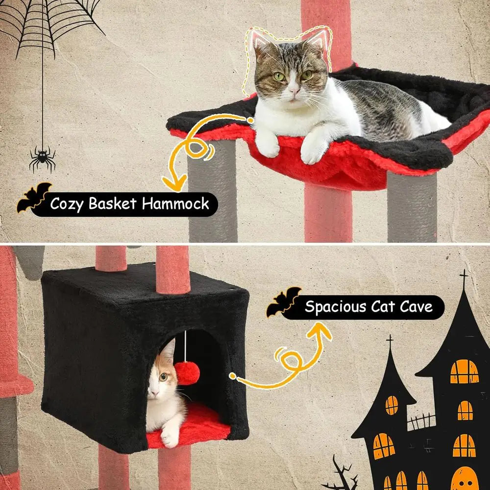 Halloween-Themed 66 Tall Gothic Cat Tree with Bed, Hammock, Toys, and Scratching Posts in Black and Red