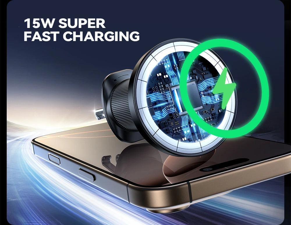 【Ultra-Fast 15W MagSafe Wireless Charging On-The-Go】Power up effortlessly! Experience genuine 15W MagSafe wireless charging right in your car. Simply snap your compatible iPhone onto the mount, and it starts charging rapidly at peak speeds. Advanced auto-alignment magnets ensure perfect connection every time. Say goodbye to messy cables and hello to convenient, fast power during your commute or road trips.