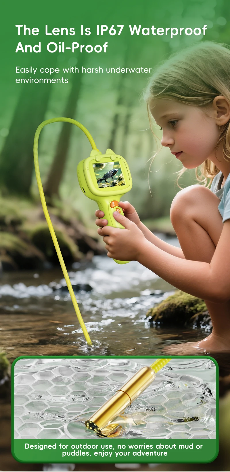 ✔️ IP67 Waterproof Lens: Dive into ponds, streams, or rainy-day quests to observe fish, aquatic plants, and underwater worlds.
