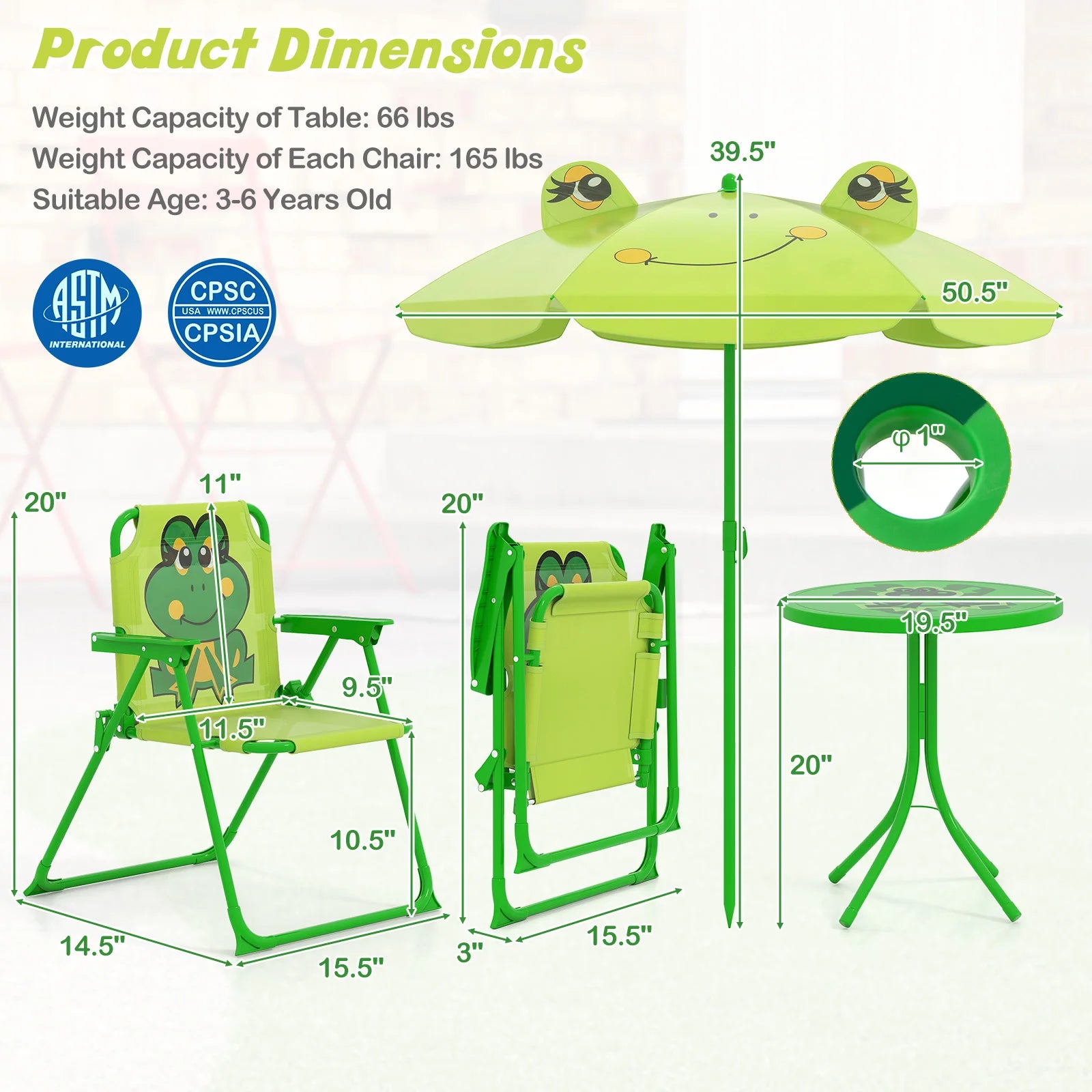 Color: Green Material: PP, HDPE, Polyester Fabric, Oxford Fabric, Metal Table Dimensions: 19.5" x 19.5" x 20" Chair Dimensions:15.5" x 14.5" x 20" Backrest Height: 11.5" Seat Width: 11.5" Seat Depth: 9.5" Seat Height: 10.5" Folded Size of Each Chair: 20" x 15.5" x 3" Canopy Diameter of Umbrella: 39.5" Pole Length of Umbrella: 47"-50.5" Suitable Age: 3-6 Years Old Weight Capacity of Table: 66 lbs Weight Capacity of Each Chair: 165 lbs Diameter of Built-in Umbrella Hole: 1" Net Weight: 9 lbs Package Includes: 1 x Table 2 x Chairs 1 x Umbrella 1 x User Guide