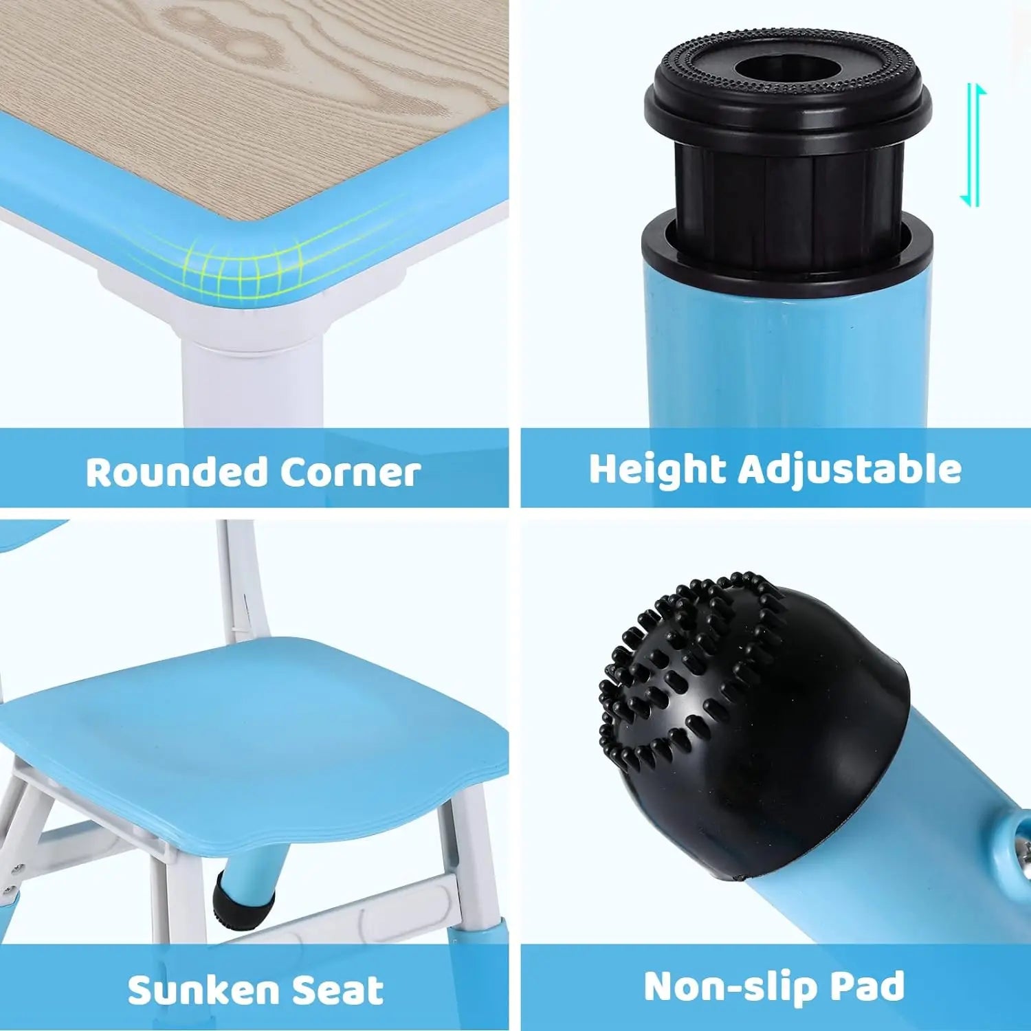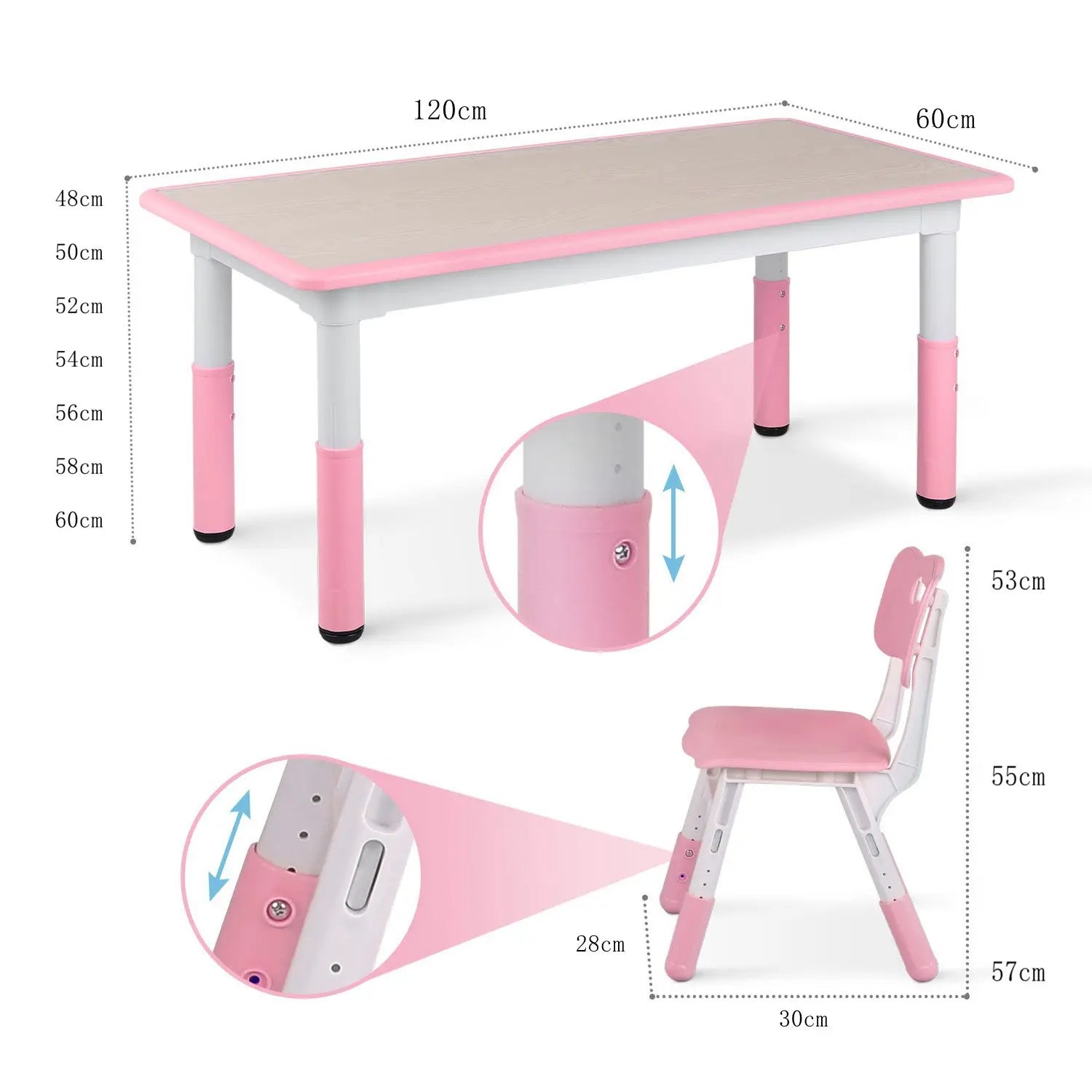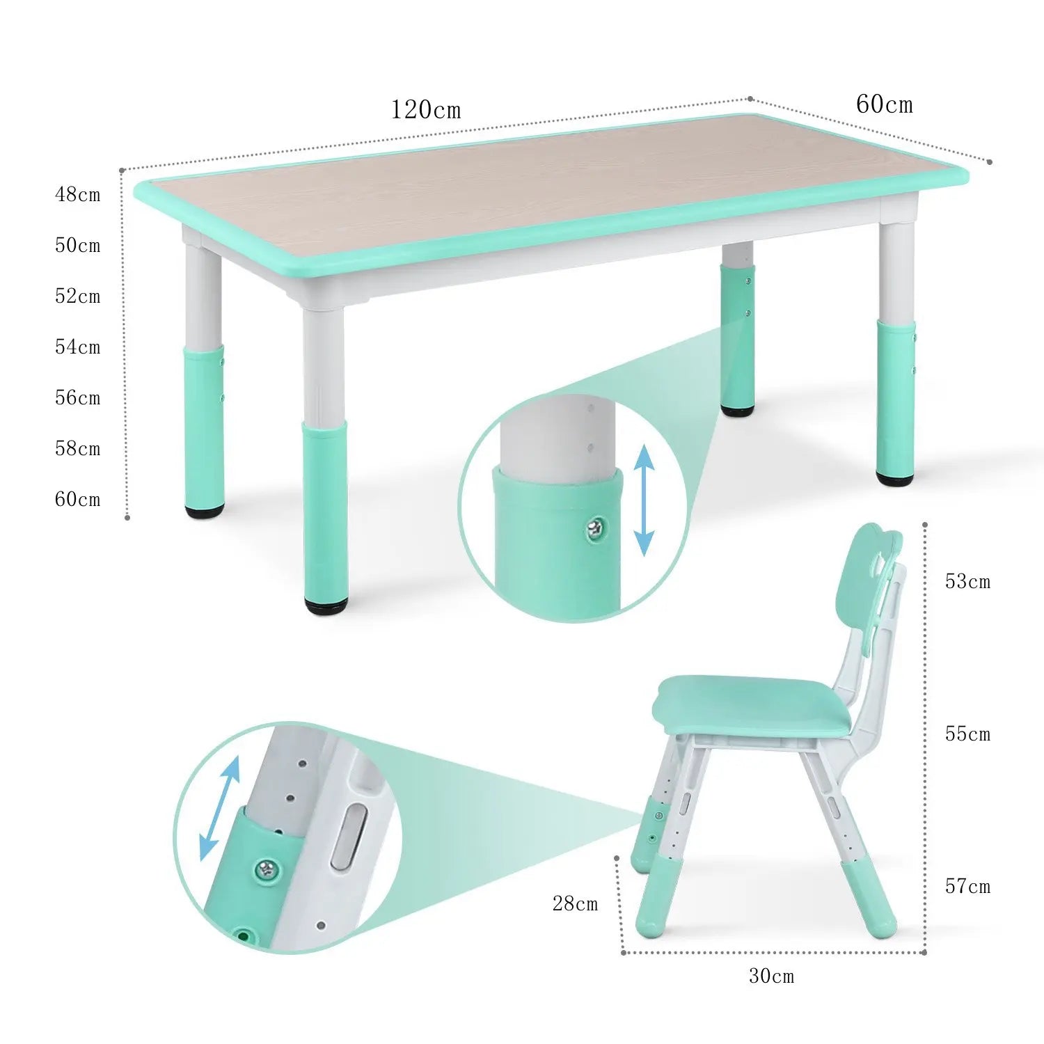 HEIGHT ADJUSTABLE DESK & SEAT: There are 5 steps for the table from 48 to 60cm, 3 steps for the chairs from 53 to 57cm, with 48*120cm table top size, suitable for boys and girls from 2 years to 10 years, 1 adjustable Table mat effectively solve the problem of uneven floor; Slanted legs prevent children from tipping over while playing.