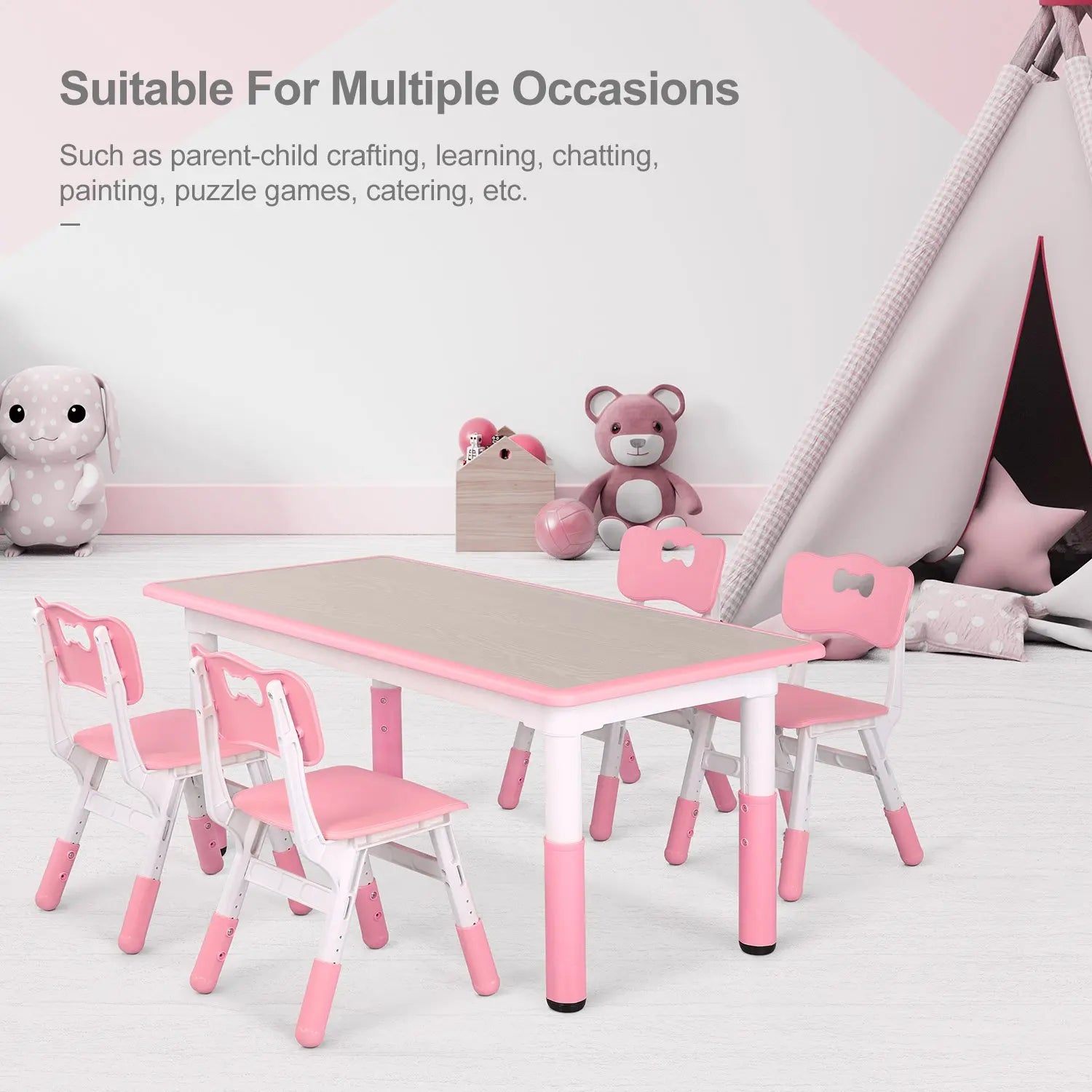 The adjustable painting table and chair set for children is made of high-quality HDPE and PVC materials. Passed CPC certification, is a professional children's furniture. The children's desk and chair set consists of a table and four chairs, both adjustable in height. It is suitable for children of different ages to use on different occasions. The table board can be used for creating children's graffiti art, allowing children to paint freely with water-based makers. It is easy to wipe with a damp cloth, practical and beautiful, very suitable for parent-child families. Beam reinforcement design that makes the table larger. The legs have an adjustable table spinner that is suitable for different types of floors. The children's table and chair set is safe and reliable, and the design is exquisite. Our children's placemat is the best choice for you and your children.