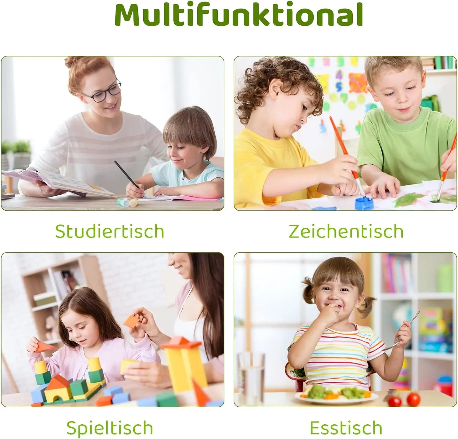 CHILD CARE: Toddlers can draw on the table top with an oil/water based brush and then wipe with wet rags. The desk also features a lip on the table edge to prevent stationery from falling, round corners to prevent bumping. Meet different uses of games, learning, eating, etc.