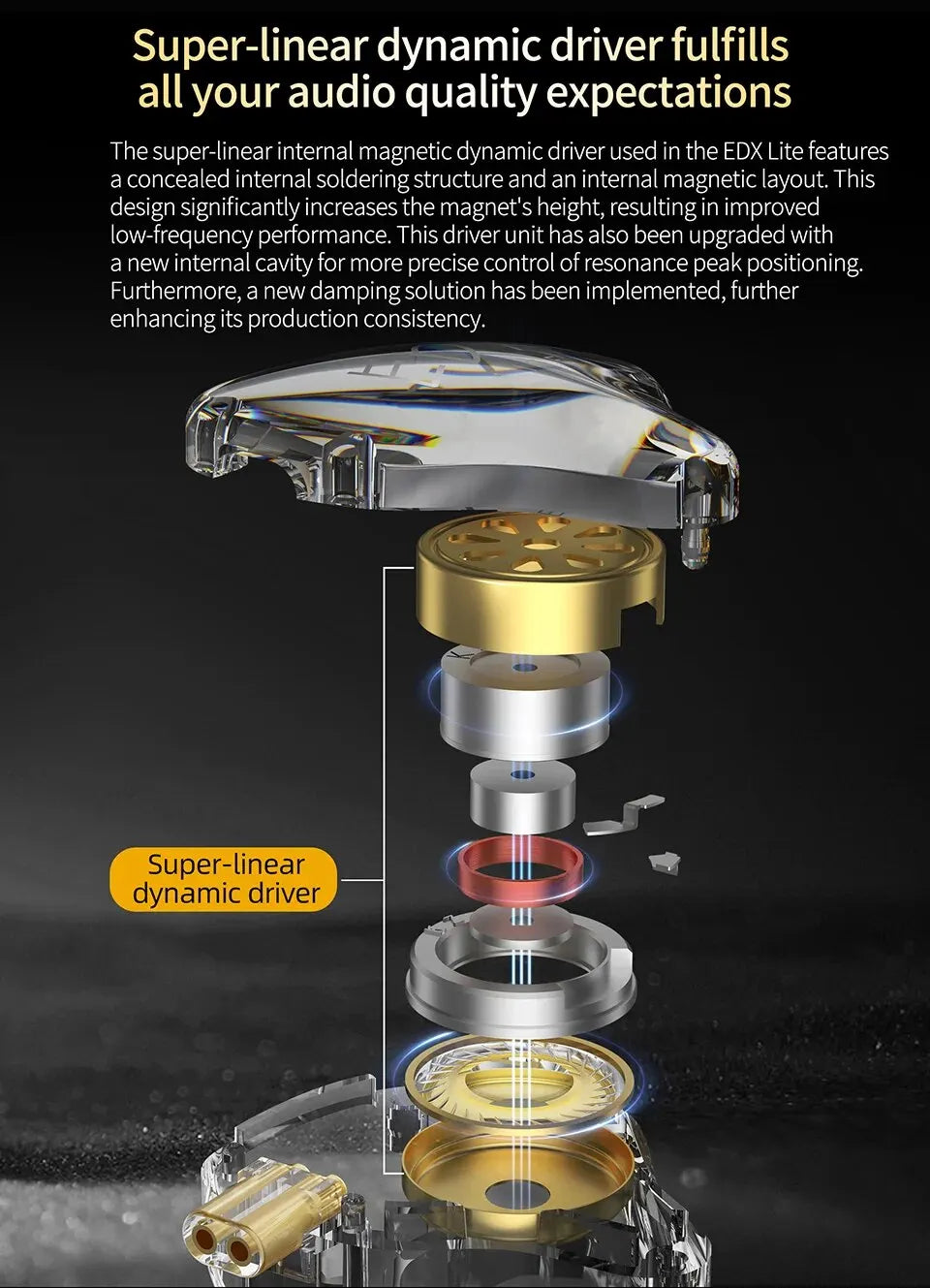 The super-linear internal magnetic dynamic driver used in the EDX Lite features a concealed internal soldering structure and an internal magnetic layout. This design significantly increases the magnet's height, resulting in improved low-frequency performance. Thisdriver unit has also been upgraded with a new internal cavity for more precise control of resonance peak positioning. Furthermore, a new damping solution has been implemented, further enhancing its production consistency.