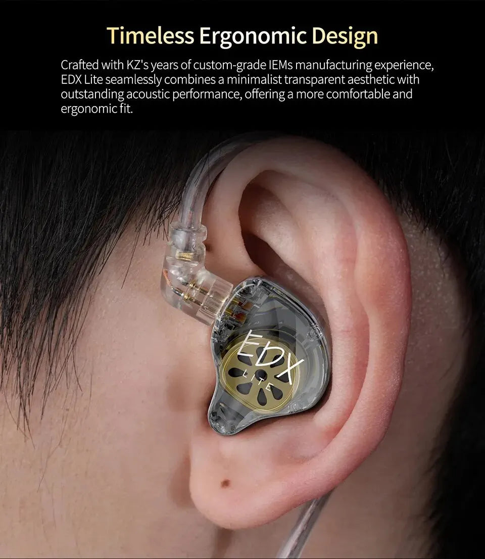 Crafted with KZ's years of custom-grade IEMsmanufacturing experience,EDX Liteseamlessly combines a minimalist transparent aesthetic with outstanding acoustic performance, offering a more comfortable and ergonomic fit.