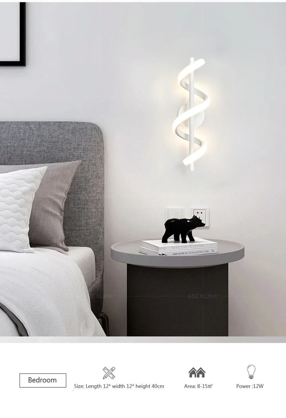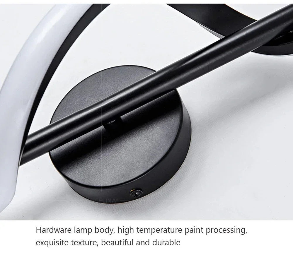 Luxury LED Wall Lamp in Gold/Black/White with minimalist spiral acrylic design. Adjustable hanging wires, durable hardware body, LED lighting for bedroom, corridor, living room, study, or balcony. Cool, warm, or tricolor light options.