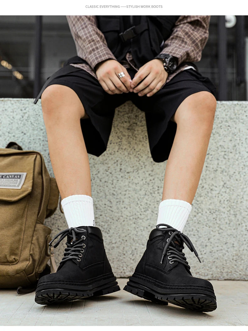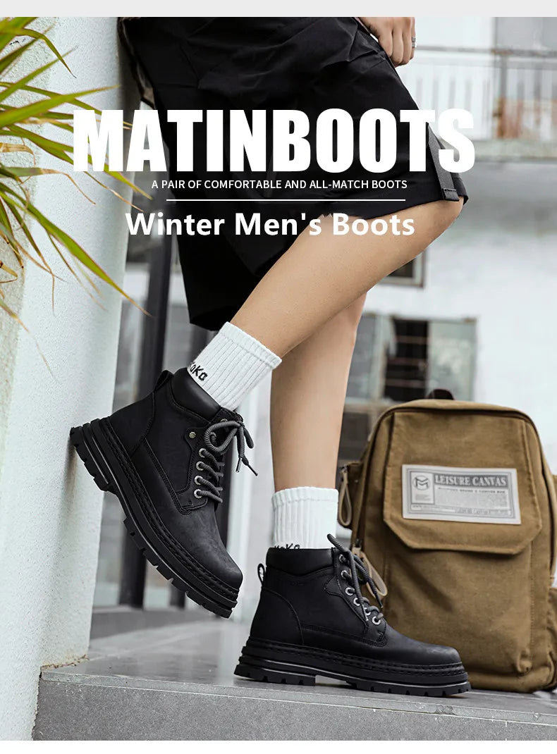 Ankle-height winter boots designed for everyday wear in cold conditions. The upper is split leather, paired with a plush lining and plush insole to provide warmth and comfort during extended wear. A rubber outsole offers grip on wet or snowy surfaces, and the lace-up closure allows a customizable fit. The boot features a low heel (approximately 1–3 cm) and a rounded toe. The shaft rises above the ankle but remains below the knee, and the overall silhouette is solid in pattern. Size runs true to fit based on the included measurements, with a wide range of men's sizes available to accommodate different foot lengths. Suitable for casual, urban use in winter weather and can be paired with denim or workwear.