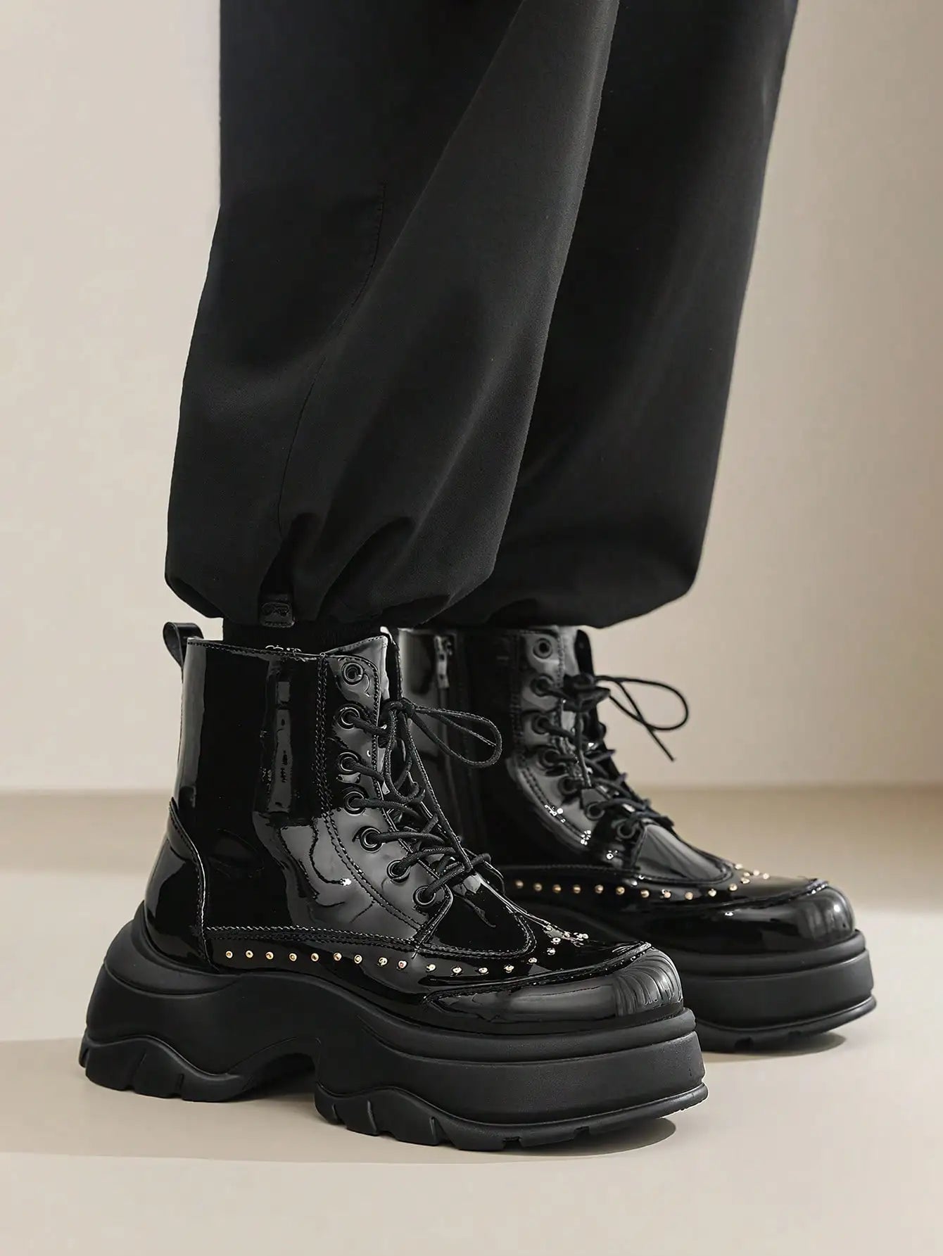 Mid-calf length boot designed for everyday wear with a lace-up front and rivet details. The silhouette emphasizes a practical, easy-to-wear fit for urban and light-duty use.