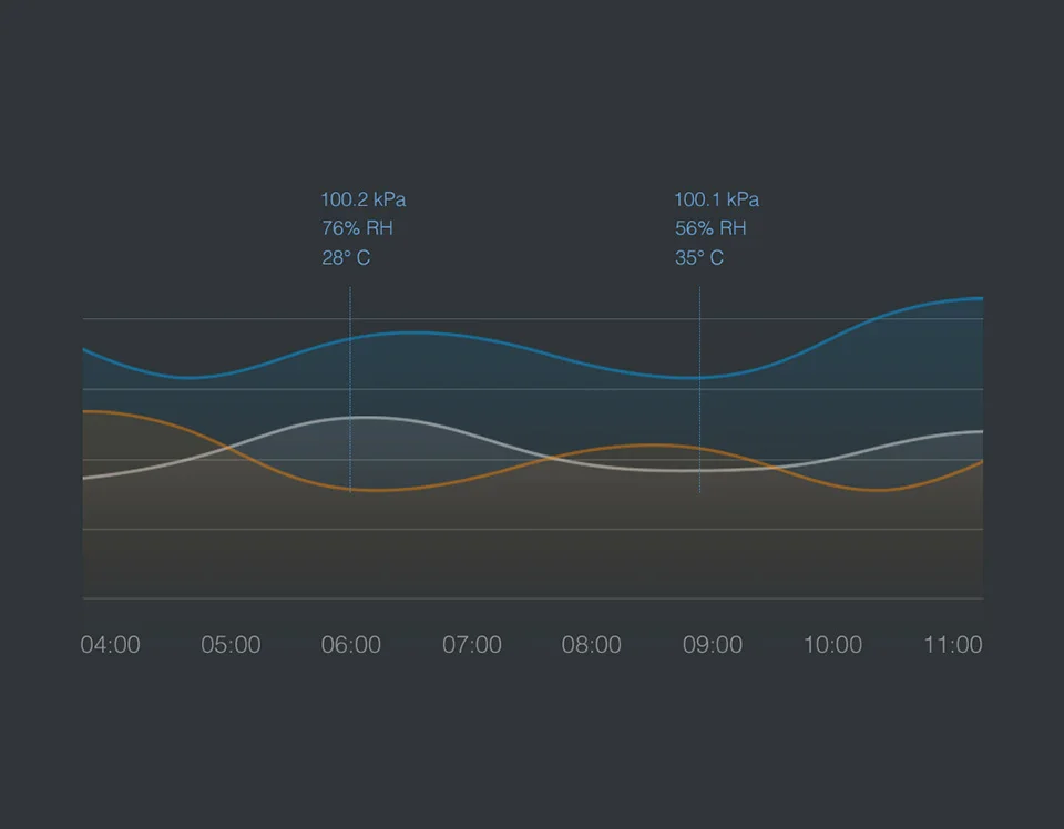 Monitors temperature, humidity, and atmospheric pressure in real time.