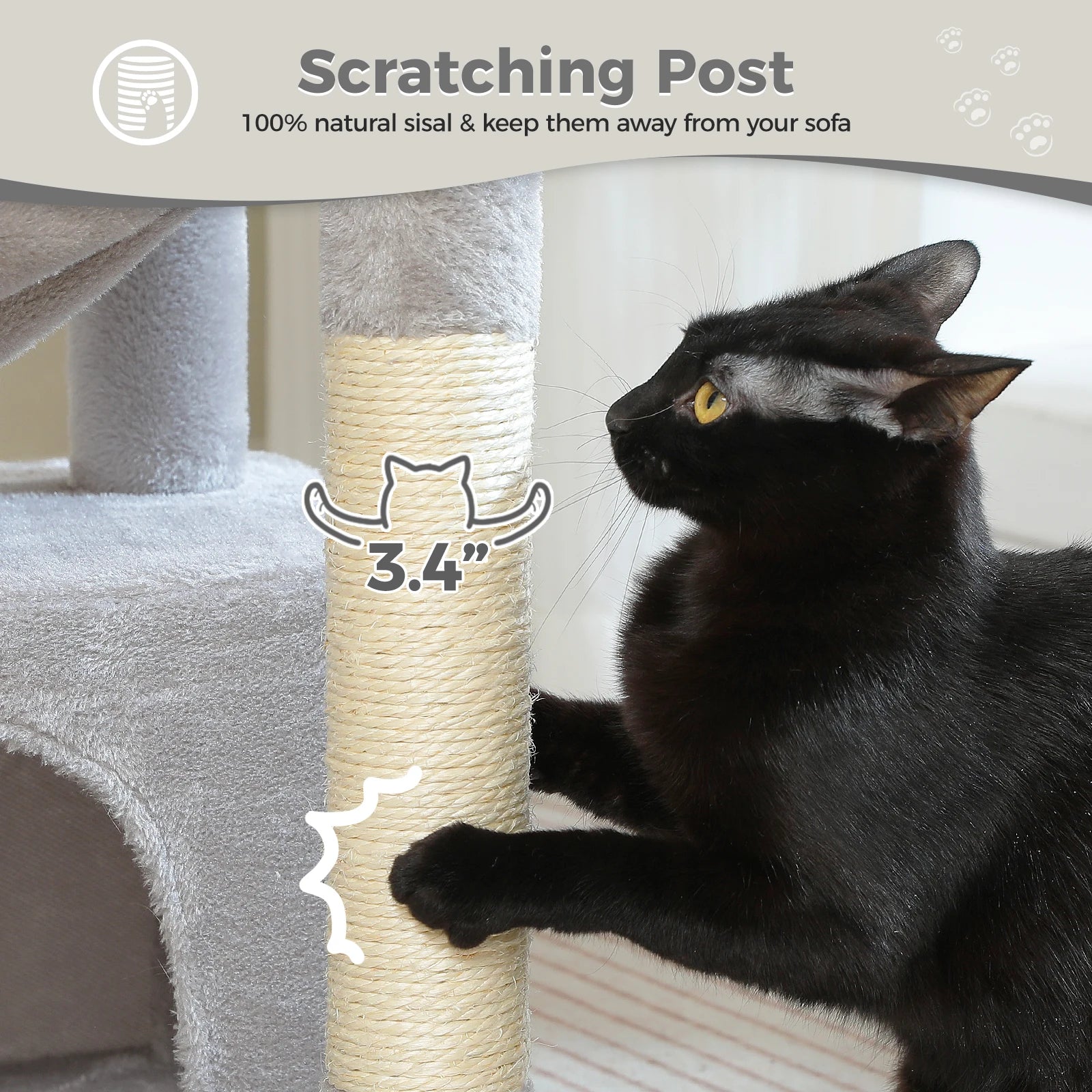 Amusing Playhouse: Euipped with a durable sisal covered scratching post and two kinds of play pompom, your furry friends will get entertainment in an unlimited time. And the cat tower can efficiently keep naughty cats away from your furniture.