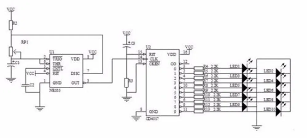 8. the middle of the circular circuit for the water lamp circuit, by the CD4017, NE555, light-emitting diodes, welding power can work.