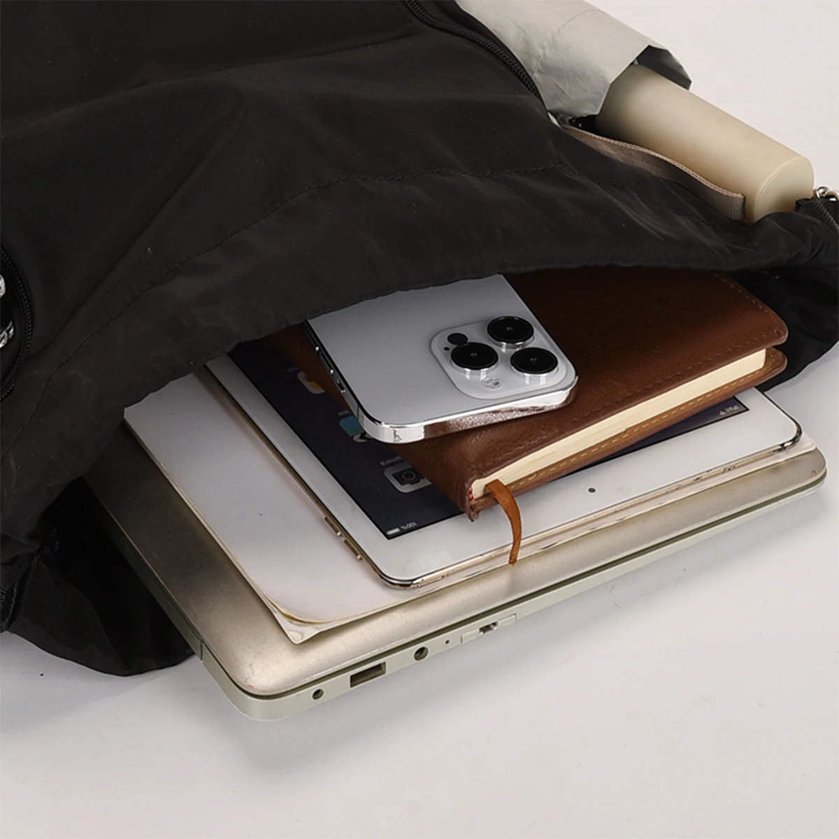 Drawstring closure enables rapid equipment retrieval during activities