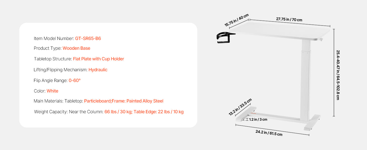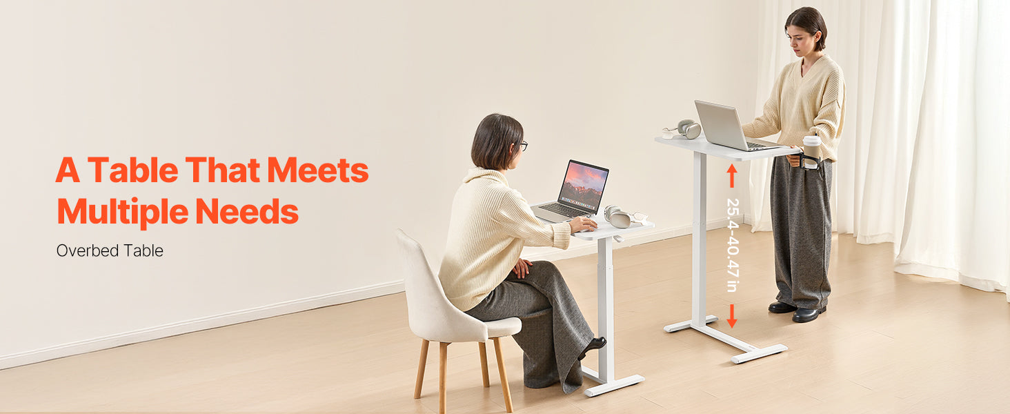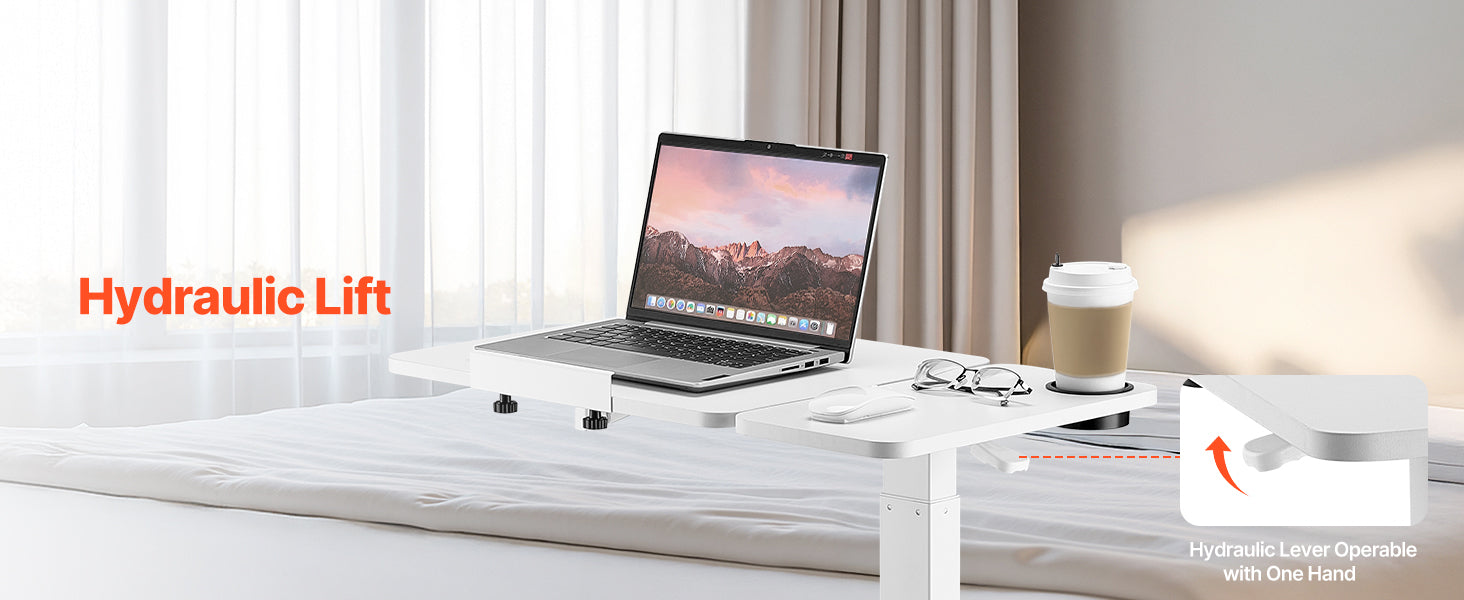 Adjustable Height: With a smooth hydraulic system, this overbed table adjusts from 25.4 in / 64.5 cm to 40.47 in / 102.8 cm — ideal for sitting and standing. Plus, the tabletop tilts 0-60°, making it ideal for reading, working, or drawing.