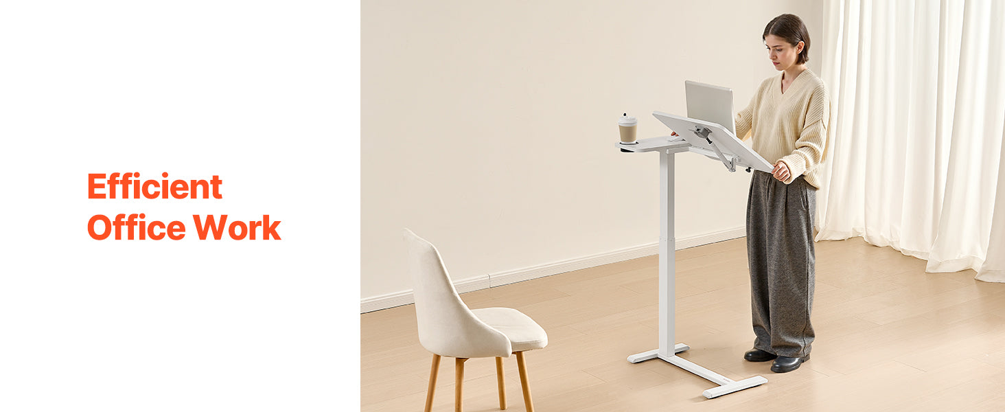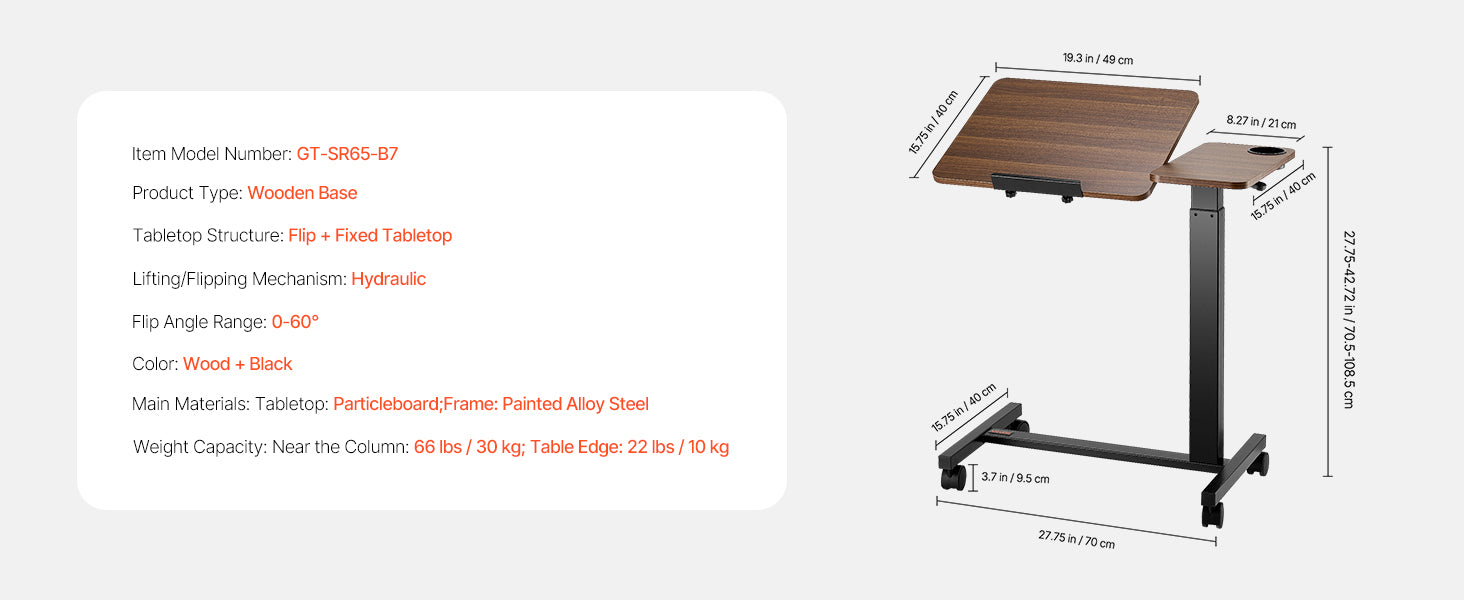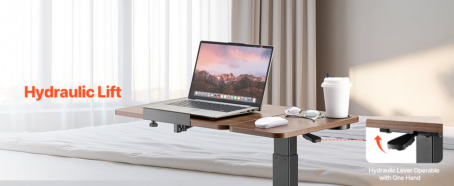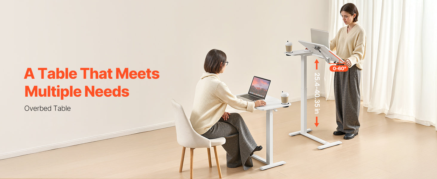 Adjustable Height: With a smooth hydraulic system, this overbed table adjusts from 27.75 in / 70.5 cm to 42.72 in / 108.5 cm — ideal for sitting and standing. Plus, the tabletop tilts 0-60°, making it ideal for reading, working, or drawing.