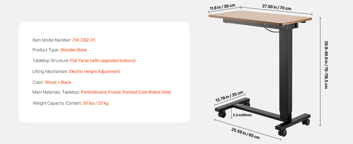 Adjustable Height: With a smooth electric system, this overbed table adjusts from 29.9 in / 76 cm to 46.6 in / 118.5 cm — ideal for sitting and standing. Plus, the tabletop tilts 0-60°, making it ideal for reading, working, or drawing.